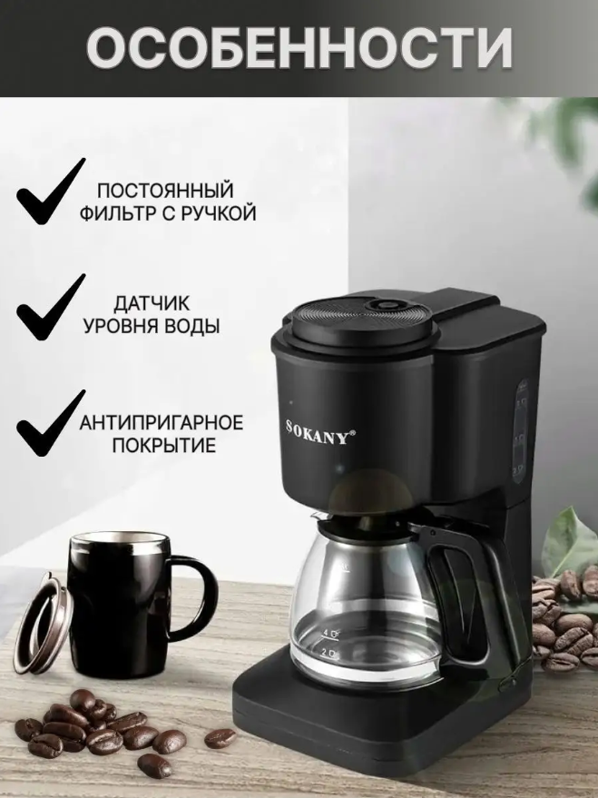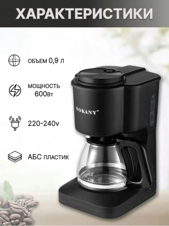 Кофемашина SK-124/Sokany/капельная кофемашина/калибровка уровня/950 вт/0,5л/ароматный и вкусный кофе /черный интересное: