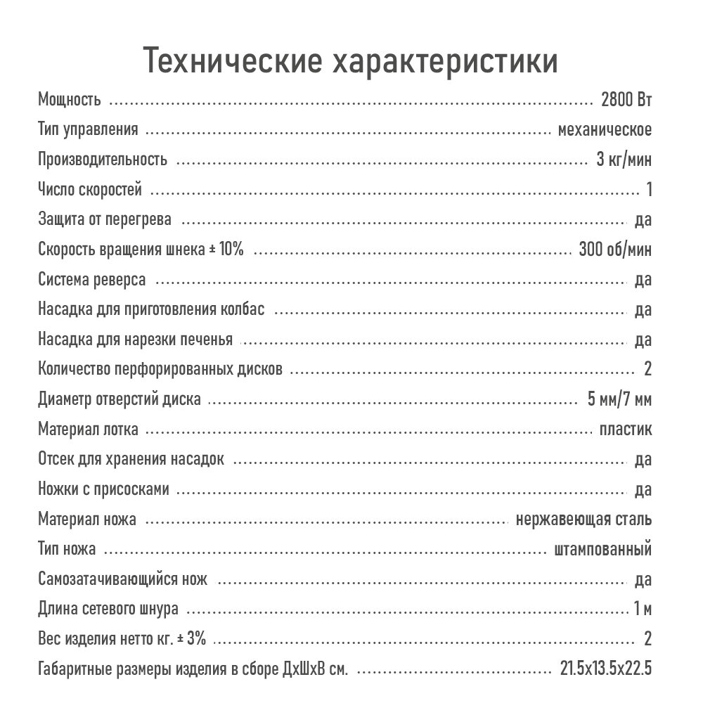| Насадки | диск для фарша / насадка для приготовления колбас |