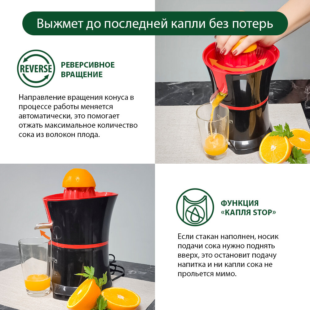 | Особенности | защита от случайного включения / реверс / система «капля-стоп» / система прямой подачи сока |
