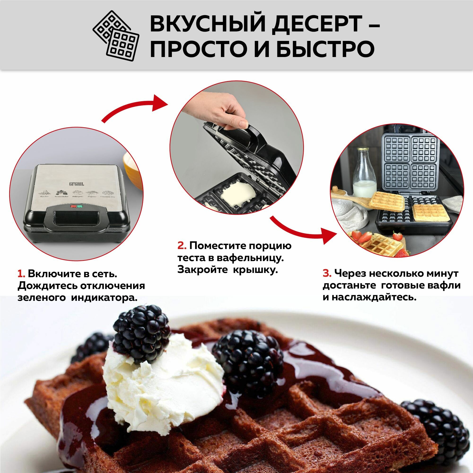 GFGRIL Вафельница на 4 вафли GFW-036 для венских и бельгийских вафлей; антипригарное покрытие; 1100 Вт; индикатор включения и нагрева интересное: