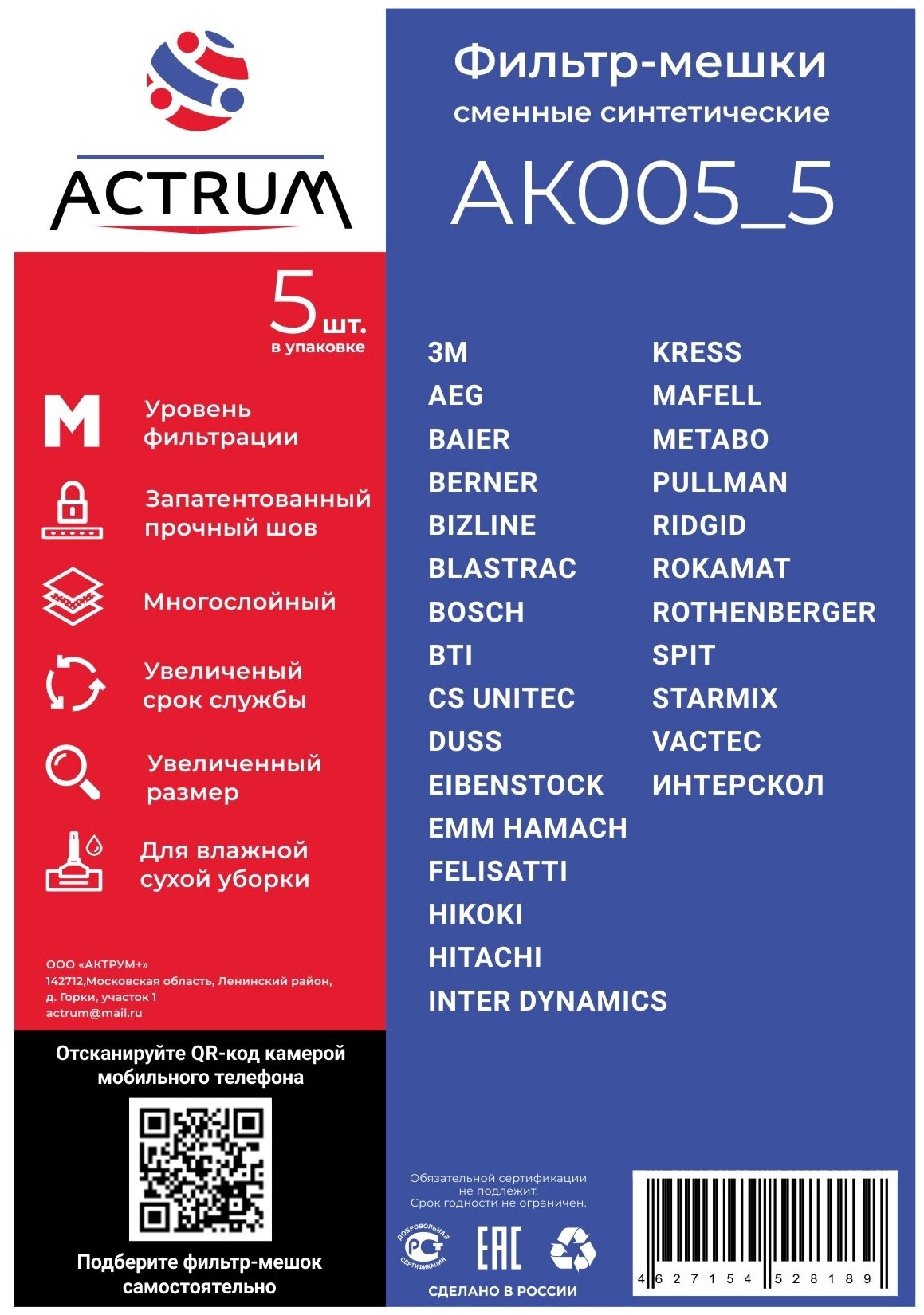 Профессиональные мешки-пылесборники Actrum АК005_5 для промышленных пылесосов BOSCH, METABO, HITACHI, STARMIX и др, 5 шт интересное: