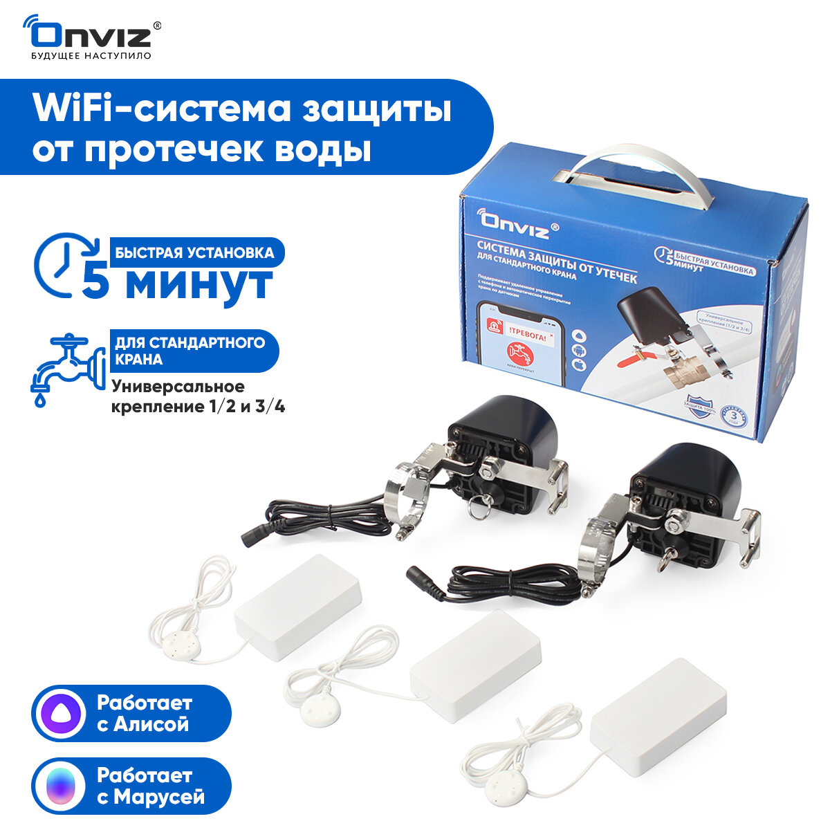 Универсальная WiFi система защиты от протечек воды Onviz, G 1/2, G 3/4, быстрый монтаж, беспроводные датчики, управление со смартфона, Алиса, Маруся интересное: