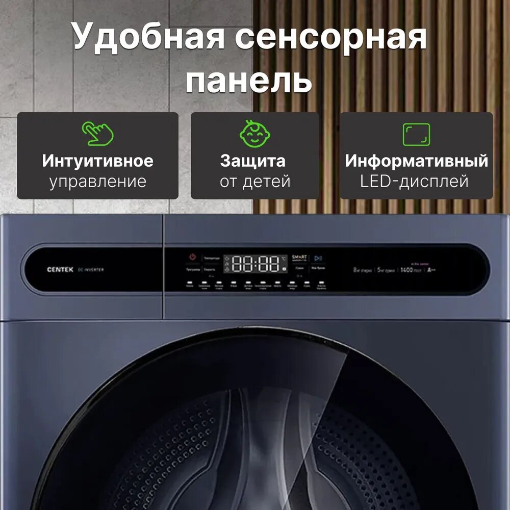 Стиральная машина Centek CT-1975 (с сушкой) прямой привод, сенсорное управление, инверторный двигатель, подсветка барабана, обработка озоном, загрузка 10 кг