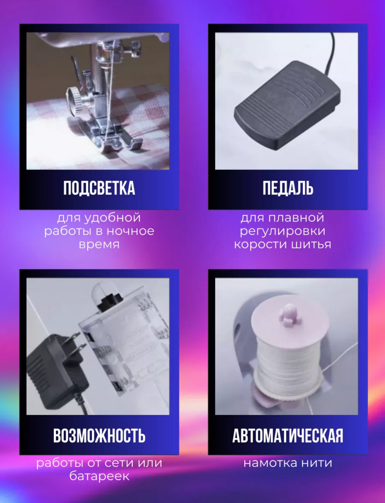 Швейная машина KaringBee FHSM-505G фиолетовый+Электрические ножницы, электрическая от сети, реверс, регулировка скорости, нитевдеватель и подсветка,12 видов строчек