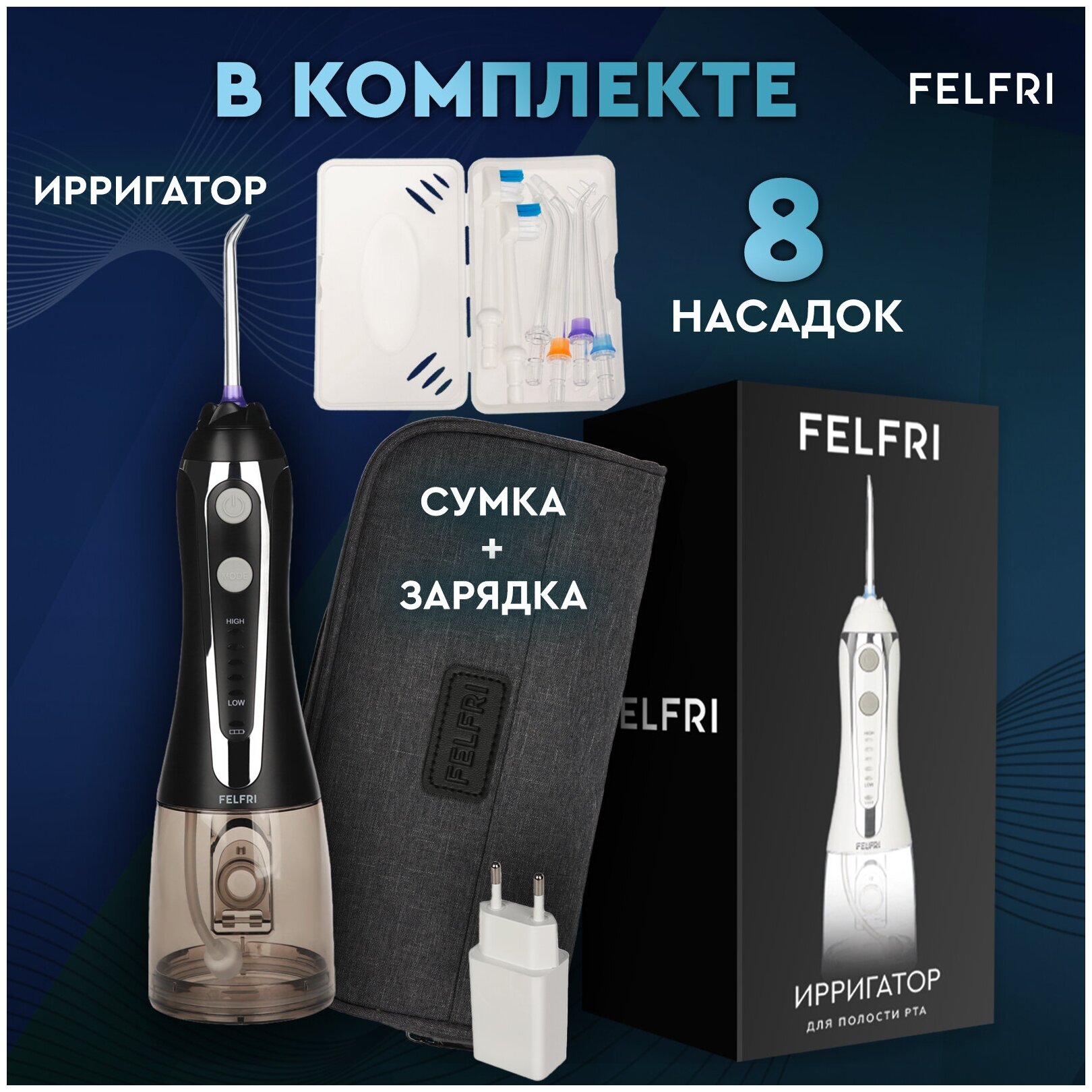 Ирригатор для зубов FELFRI 8 насадок чёрный/ Ирригатор для полости рта / для чистки зубов, брекетов, имплантов