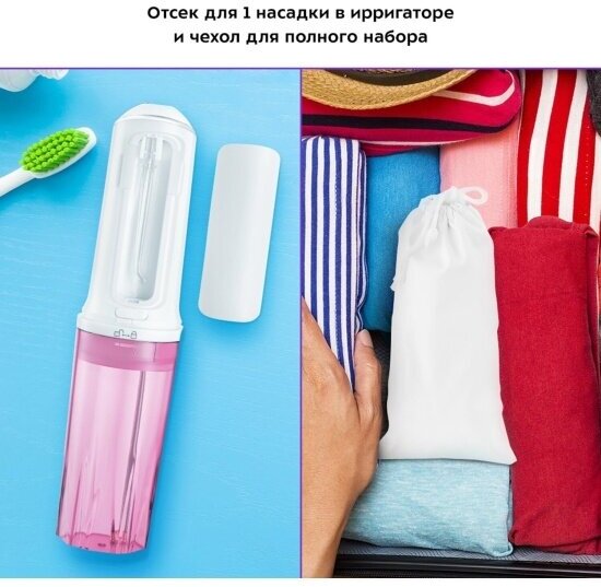 Компактный, можно удобно сложить его в дорогу, предусмотрено даже место для насадки (в собранном состоянии обычного размера для ирригатора) Выбранный режим Сохраняется, не нужно каждый раз при включении выбирать нужную мощность Зарядка от USB-C, идеально, не нужно брать с собой отдельный провод в поездку. Много насадок, обычных, которые я использую, в наборе сразу две |