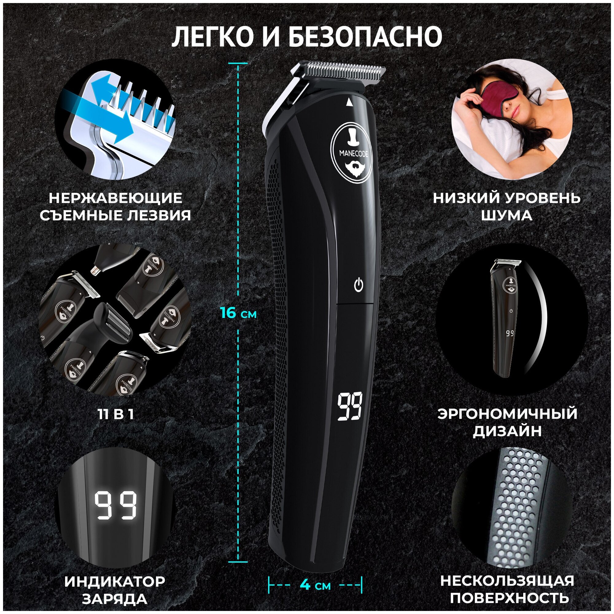 Триммер для бороды и усов Manecode Black Barba 12 в 1 с насадками для носа, волос и тела - В комплекте трафарет и фартук для бритья интересное: