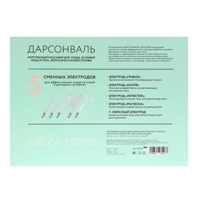 Дарсонваль Gezatone BP-7000, 5 насадок, для лица, тела и волос, бирюзовый