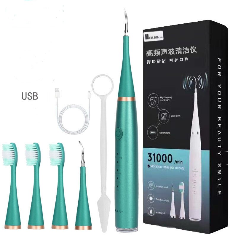 2 в 1 Cтоматологический скалер и зубная щетка Green (5 насадок + зеркало лопатка + USB кабель) интересное: