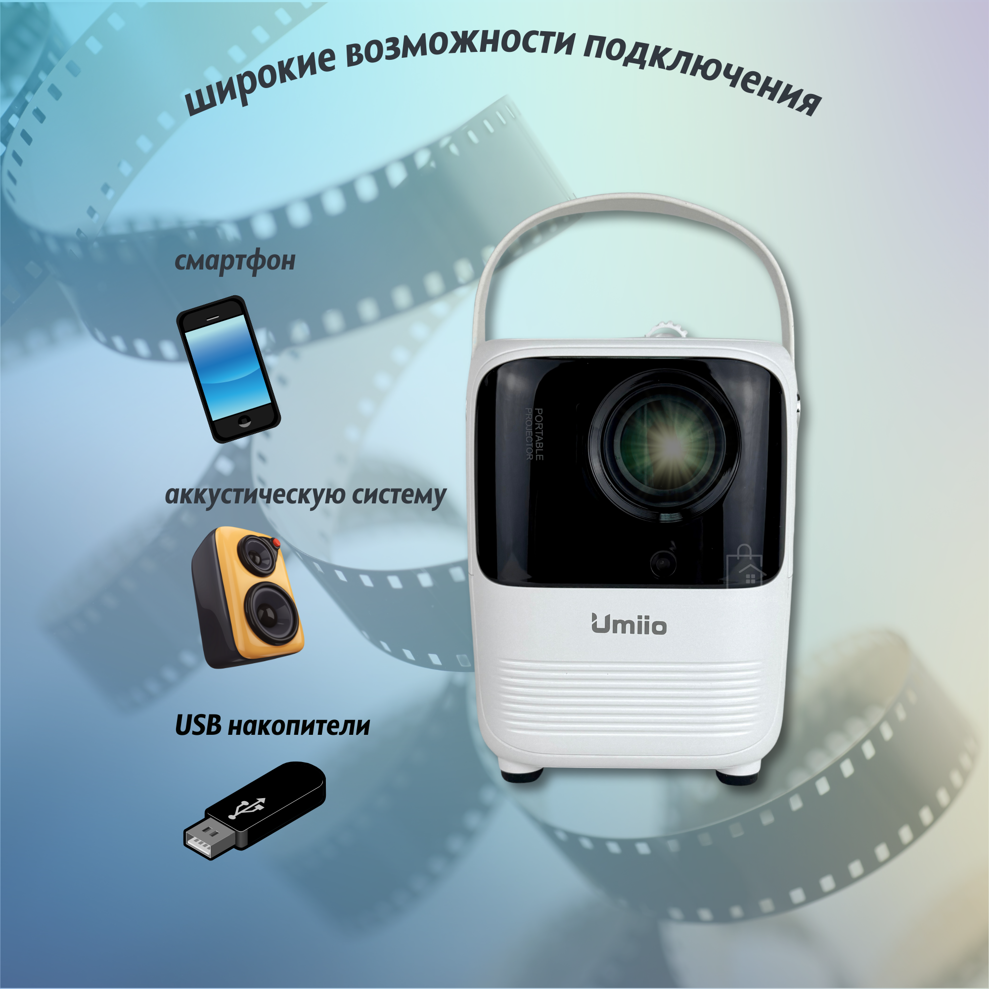 Портативный проектор, для домашнего кинотеатра, Bluetooth, WI-Fi, Full HD с русским языком, Umiio Q1, белый
