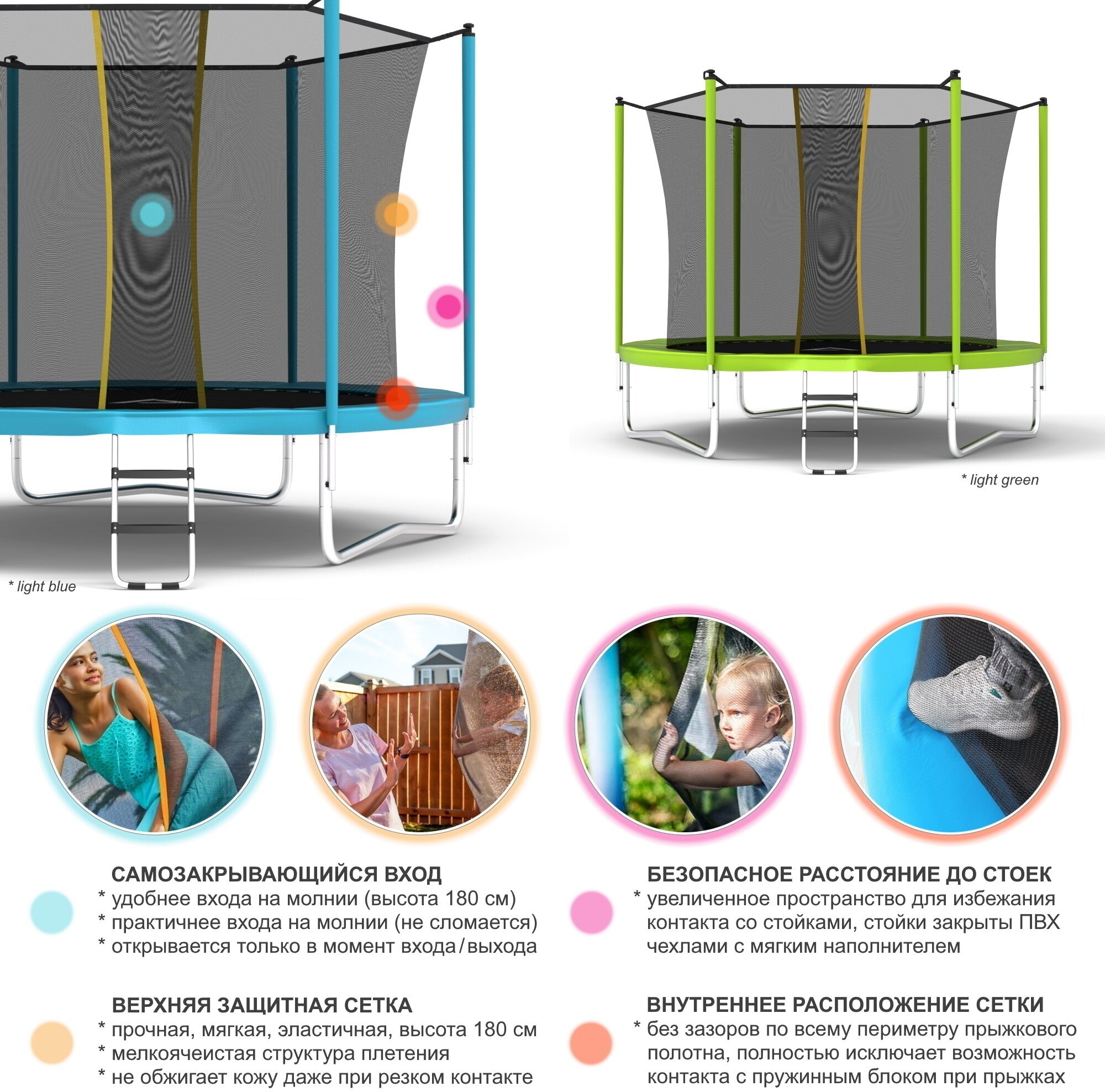| Состав набора | Каркас батута, прыжковое полотно, комплект пружин, защитный мат, верхняя защитная сетка, лестница, ключ для установки пружин, набор инструментов и крепежей, инструкция по сборке и эксплуатации на русском языке |