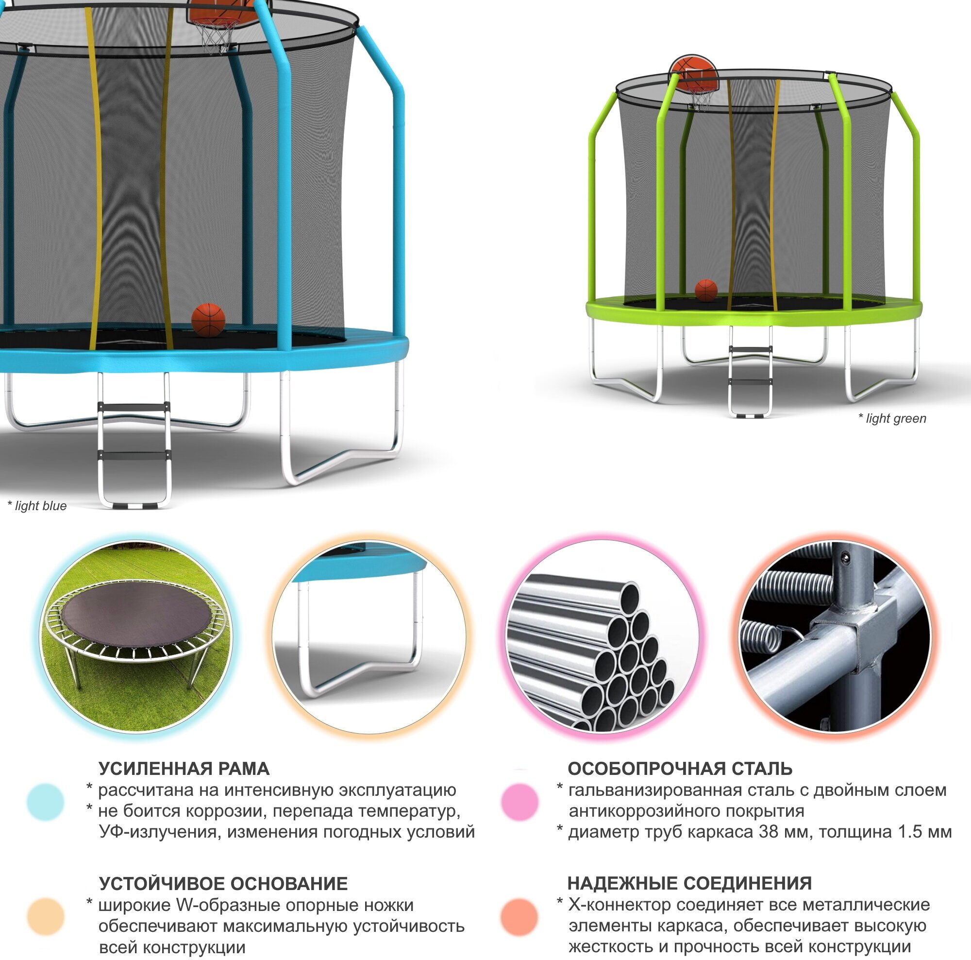 | Особенности | W-образные опоры / баскетбольное кольцо / защита пружин / с защитной сеткой / с лестницей |