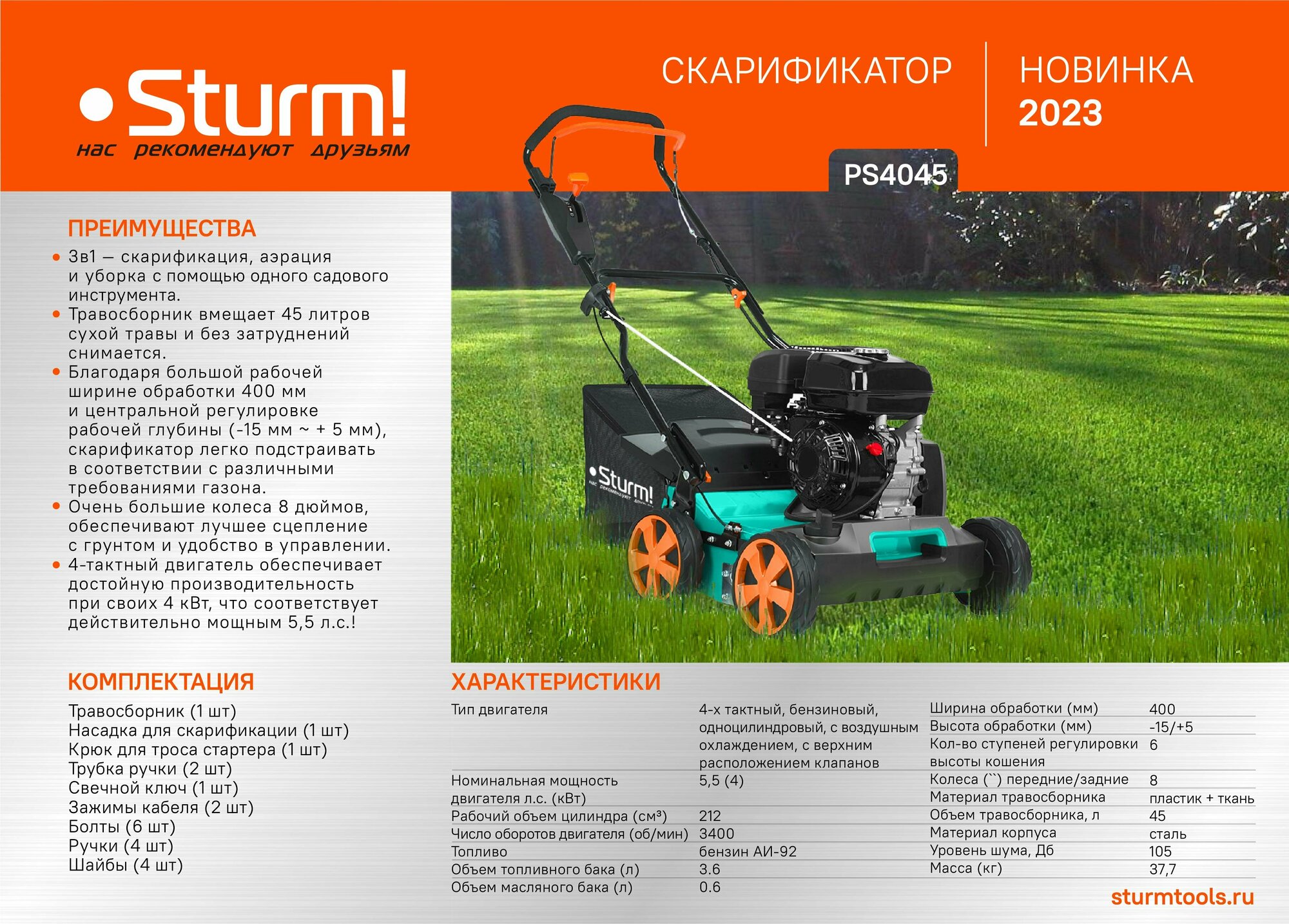 PS4045 Бензиновый скарификатор 5,5л.с.,шир. 400мм.,глуб. +5-15мм.,трав-ник 45л.колеса 8″ Sturm!