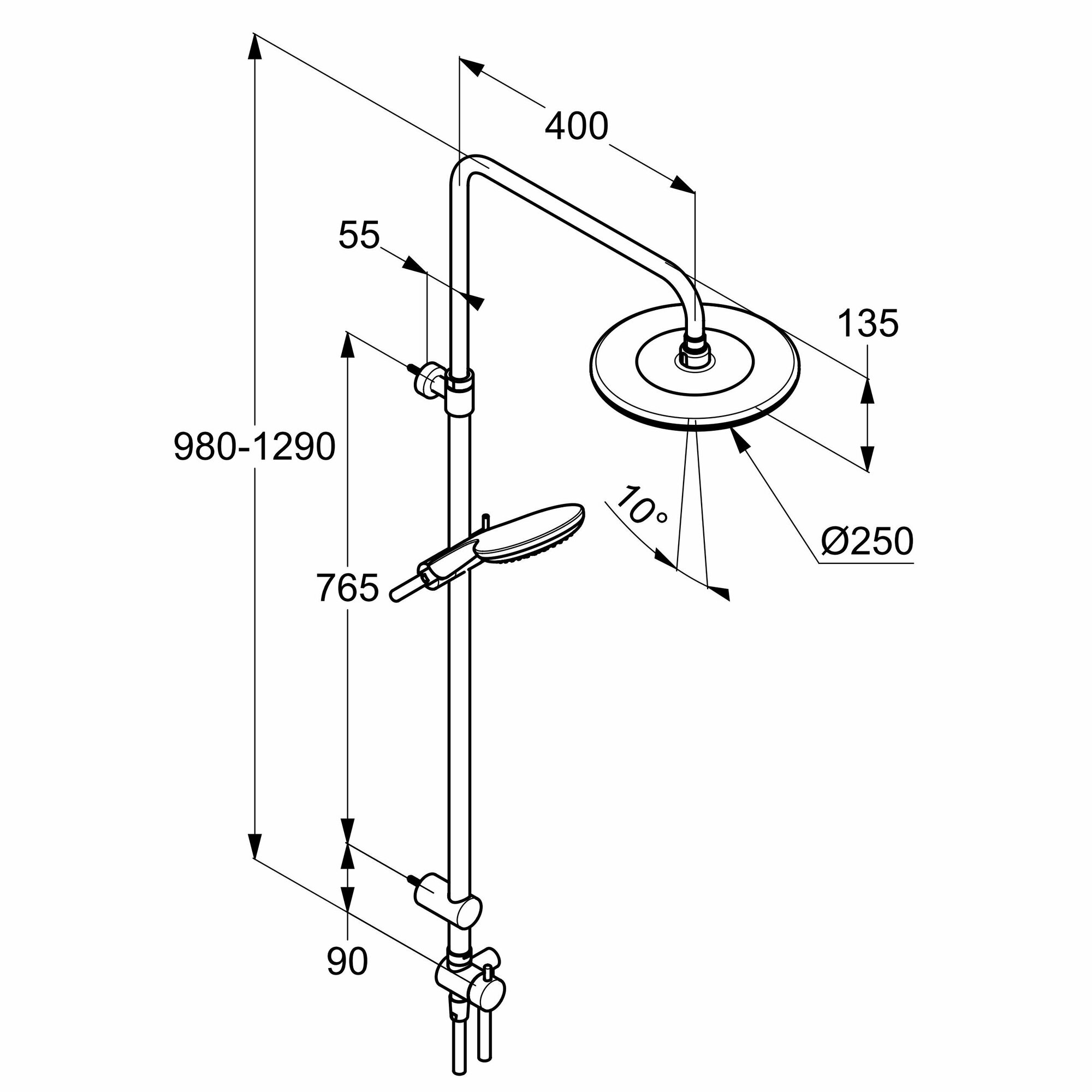 | Дополнительная информация | высота стойки для душа: 1290 мм; диаметр душевой лейки: 140 мм; диаметр верхнего душа: 250 мм |