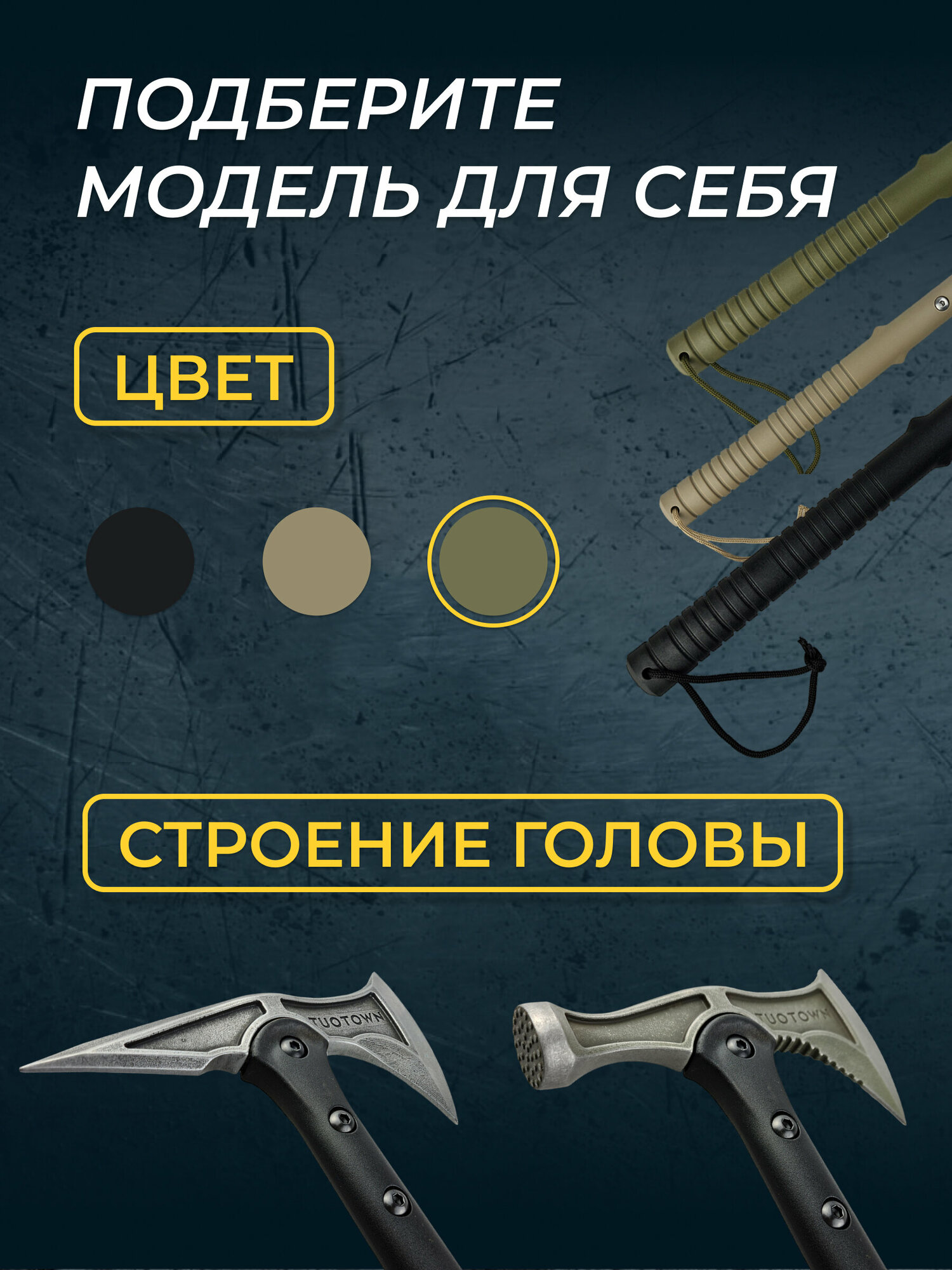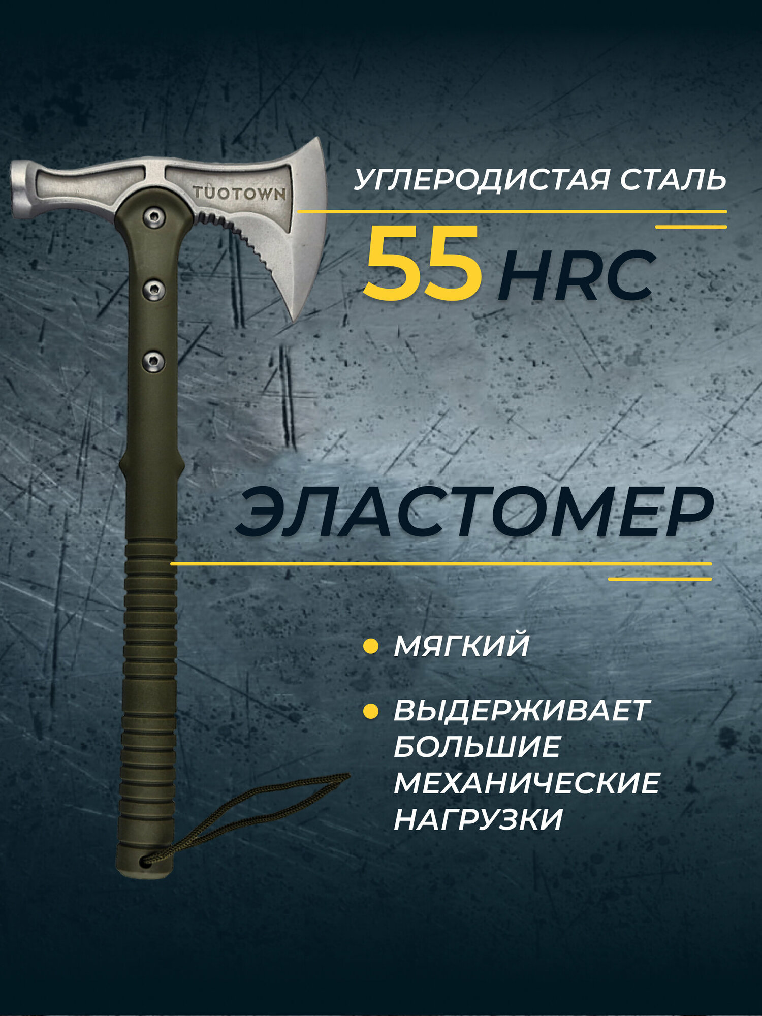Топор туристический (томагавк) с ледорубом, TuoTown. Японская нержавеющая сталь 420J2 / Эластомер, цвет Олива.