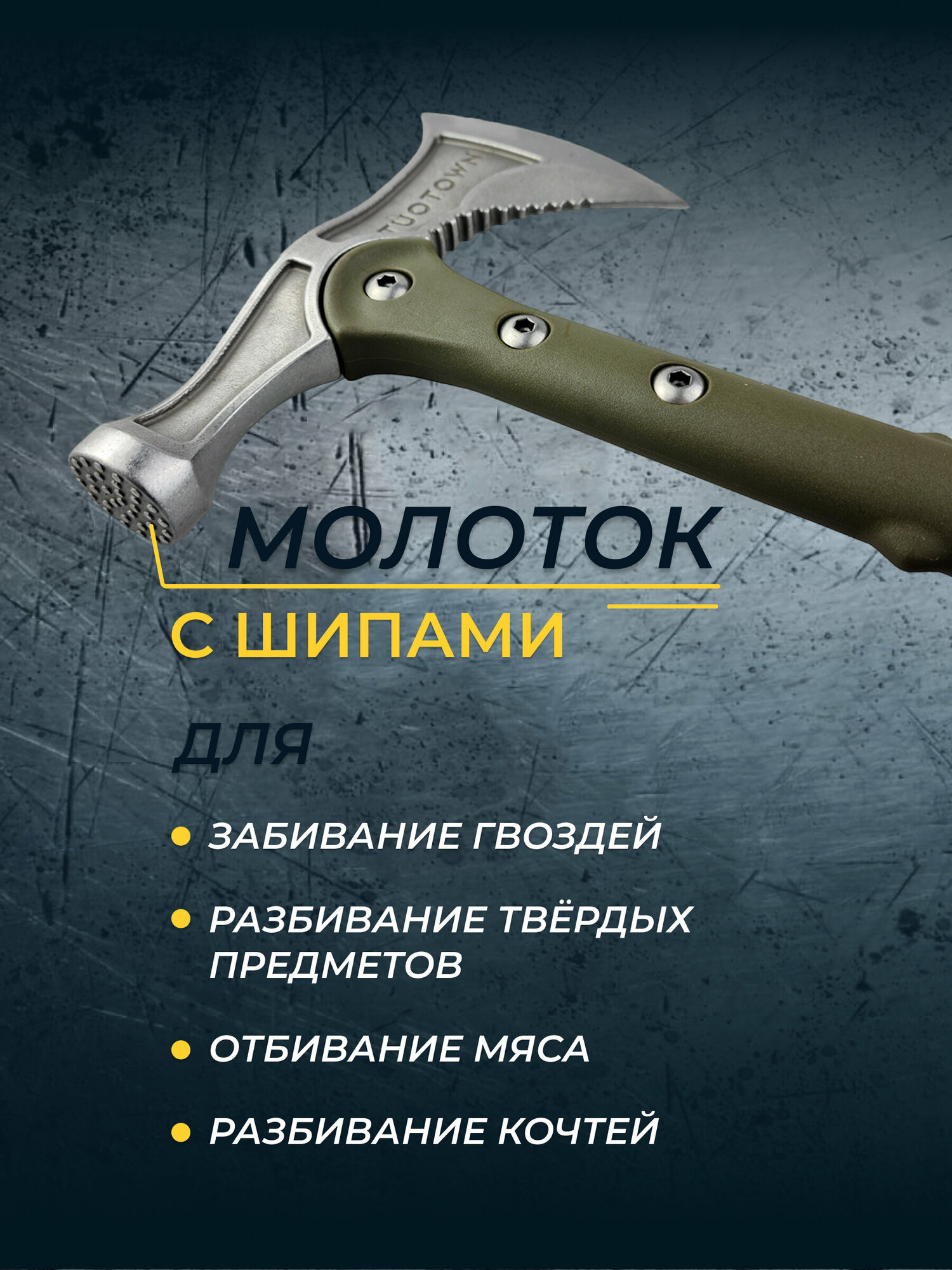 Топор туристический (томагавк) с молотковым обухом и насечкой, TuoTown. Японская нерж. сталь / Эластомер, цвет Олива.