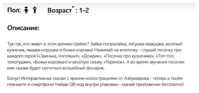 | Отзыв: | Игрушка заинтересовала ребенка в пол года. Нажимает что может и слушает сказку. Конструкция прочная, батарейки на винтике — ребенок не доберётся. Из минусов только то, что нельзя выключить кнопкой, как например, другие смартфончики этой же фирмы. |