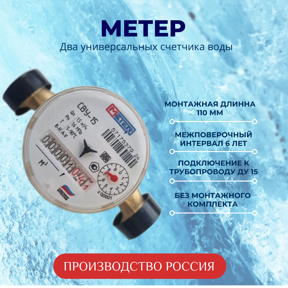 Счётчик воды универсальный метер 1/2" СВУ-15-110 мм с прокладками и без комплекта монтажных частей - 1 шт интересное: