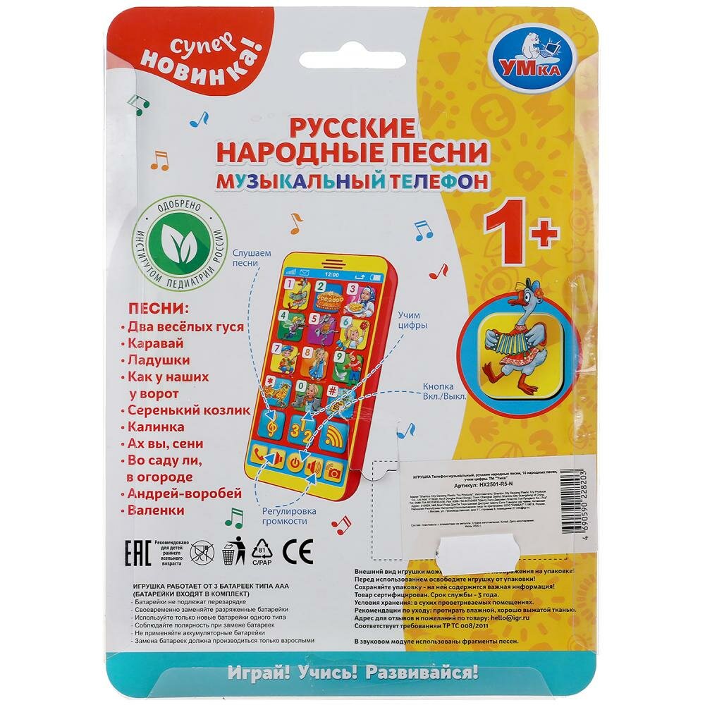 Музыкальный телефон русские народные песни. 10 песен, учим цифры.блистер