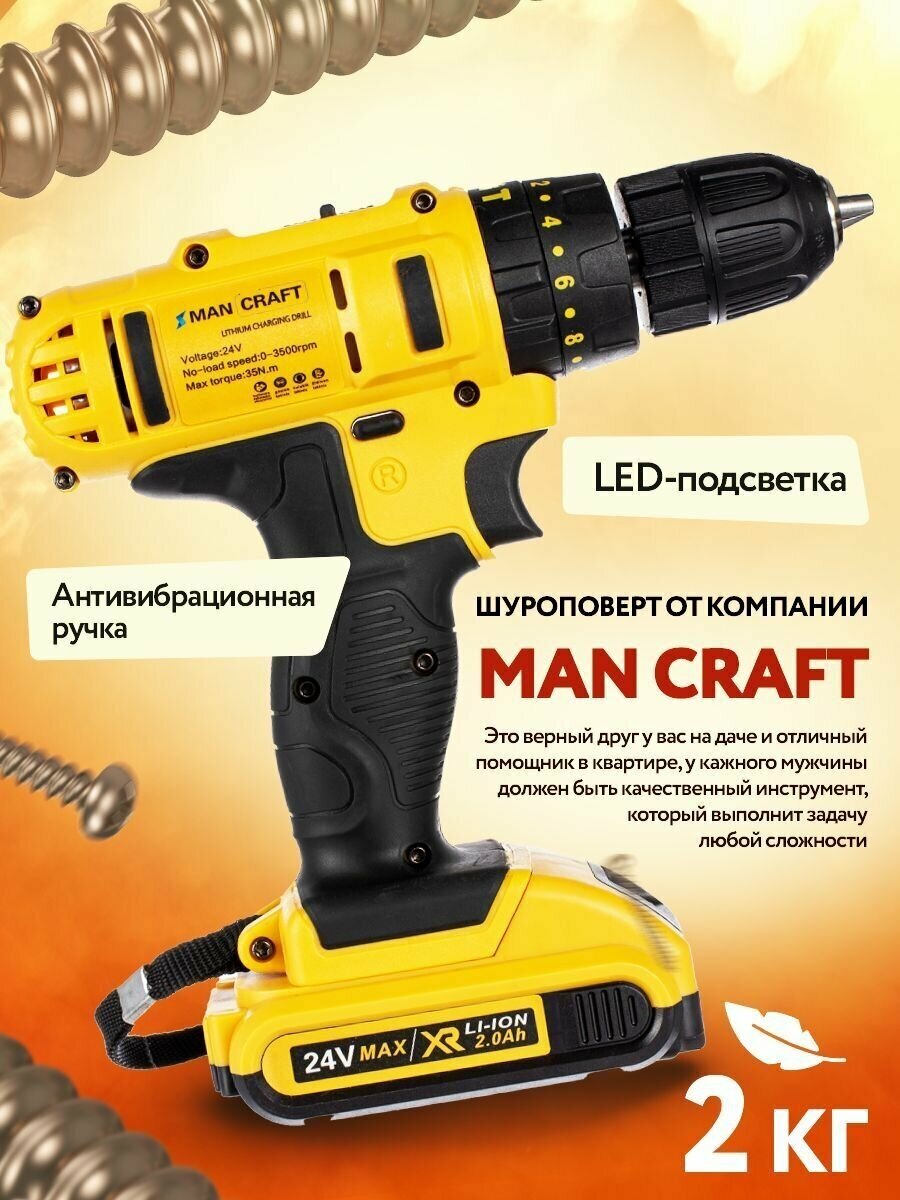 • Дрель-шуруповерт аккумуляторная 24 В кейс+набор оснастки, 25 Нм, 3500 об/мин дрель ручная с 2 скоростями и фонариком, электроинструмент MANCRAFT интересное: