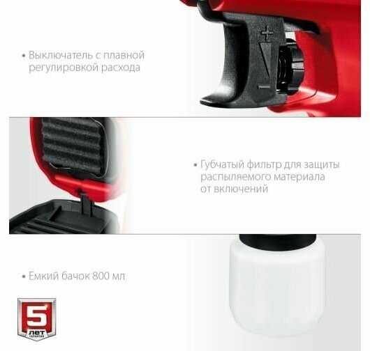 | Плюсы: | За эти деньги просто шикарный краскопульт! За полдня жена перекрасила кухню на даче, дольше снимал фасады. Но для полноты счастья обязательно к покупке второй бачок для промывки и сопло меньшего диаметра! |
