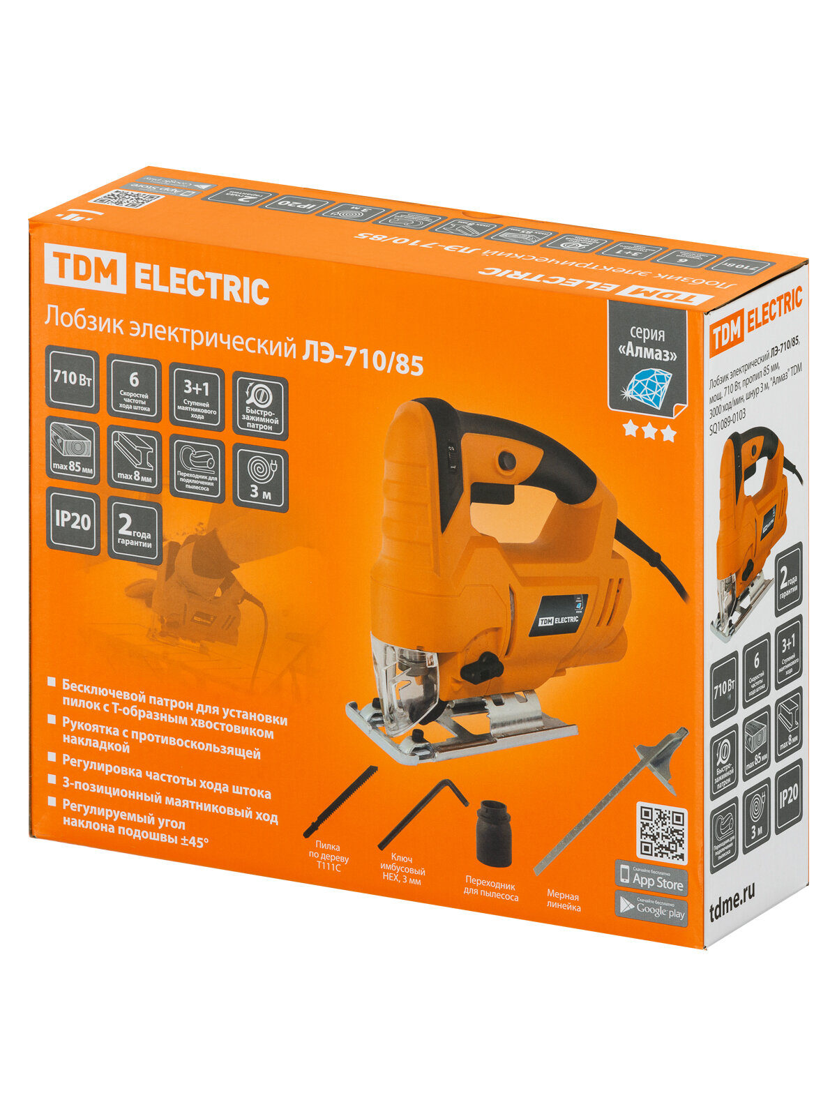 Лобзик электрический Tdm Electric ЛЭ-710/85, мощ. 710 Вт, пропил 85 мм, 3000 ход/мин, шнур 3 м, "Алмаз", SQ1089-0103