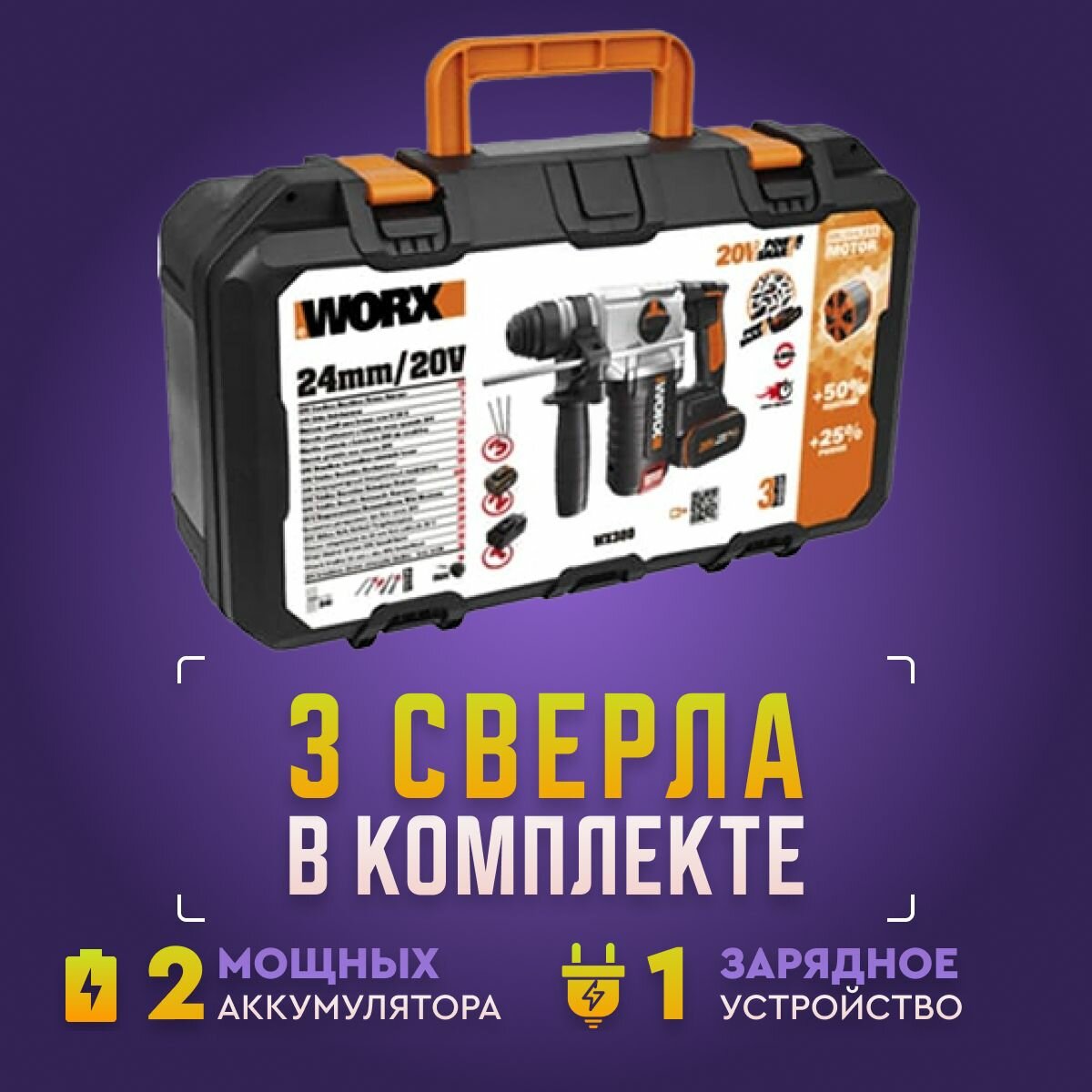 Перфоратор аккумуляторный бесщеточный WORX WX380, 20В, 4Ач x2, ЗУ 2А, кейс интересное: