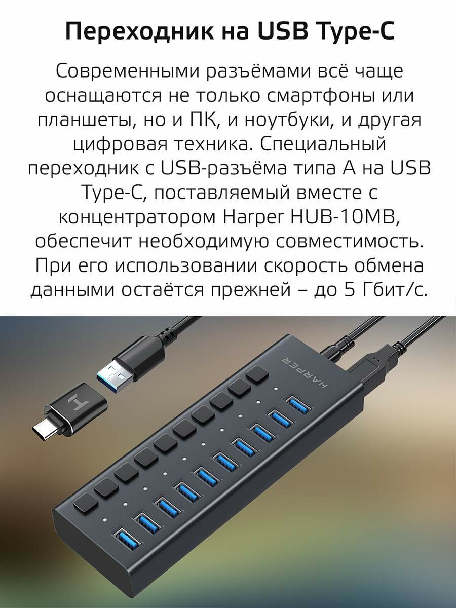 HARPER HUB-10MB Black USB-концентратор, Интерфейс: 10 х USB 3.2, Переходник: USB 3.0 / Type-C, Скорость передачи данных: до 5 Гб/с, Материал