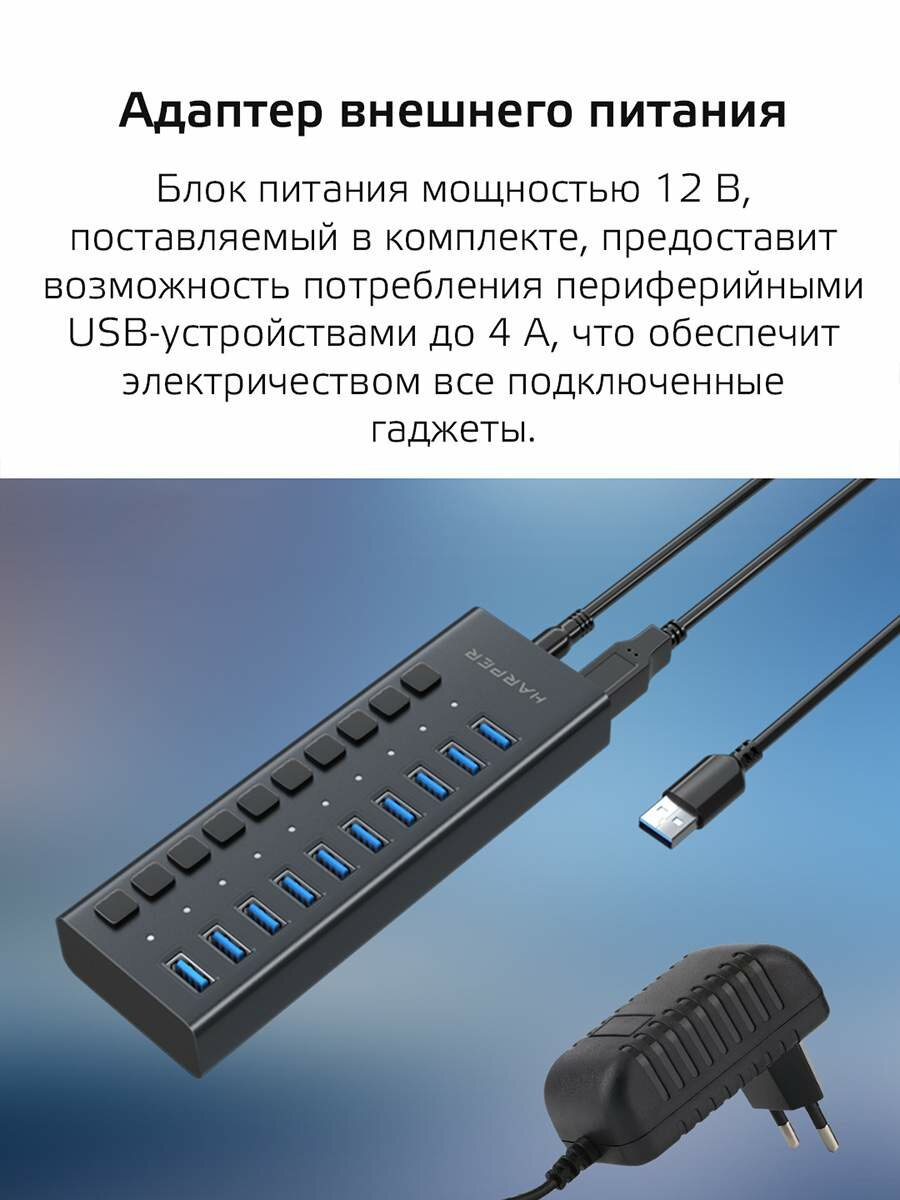 USB Концентратор HARPER HUB-10MB / 10 портов USB 3.0 / скорость передачи данных до 5 Гб / c, черный