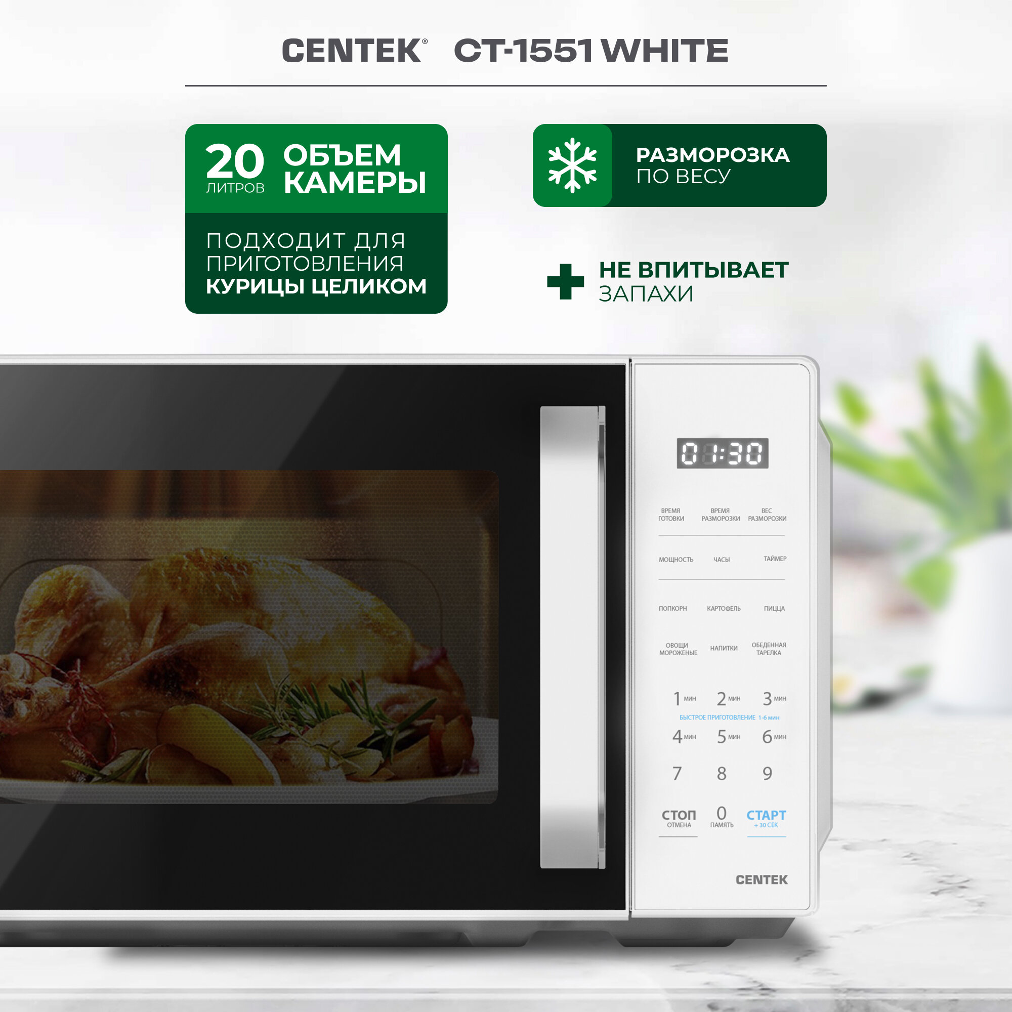 Centek СВЧ 700W 20лоткрывание дверцы ручкой, премиальная упаковка, таймер 30 мин CT-1571 White
