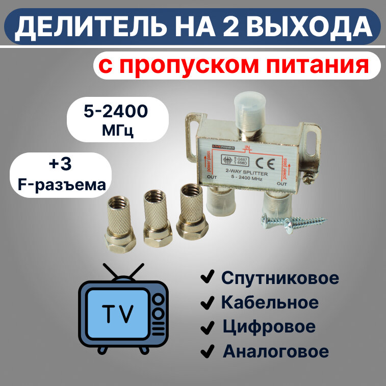 Делитель телевизионного сигнала на 2 выхода с пропуском питания 5-2400МГц (двойник, разветвитель) + 3 F-коннектора интересное: