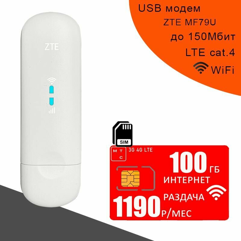 Комплект модем ZTE MF79U (RU) + сим карта МТС для интернета и раздачи, 100ГБ за 1190р/мес.
