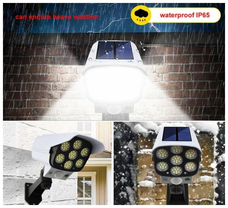 | Плюсы: | хорошая имитация настоящей камеры с мигающим глазком, яркий фонарь, датчик движения реально реагирует с 4 метров. |