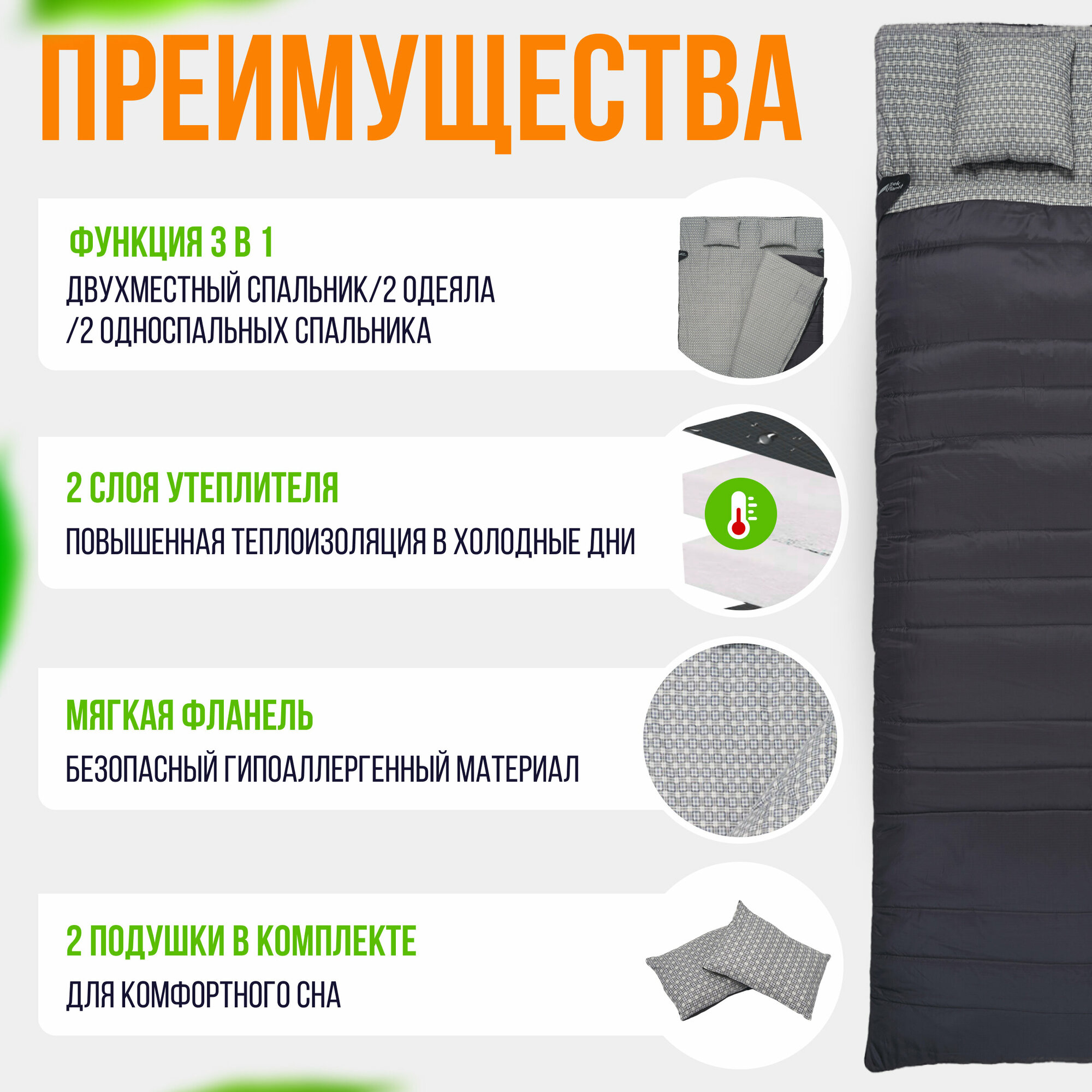 | Минусы: | практически невозможно свернуть в чехол так как спальник очень скользкий с внешней стороны . если вывернуть его мягкой стороной наружу то ситуация улучшается но все равно проблемно его убрать . |