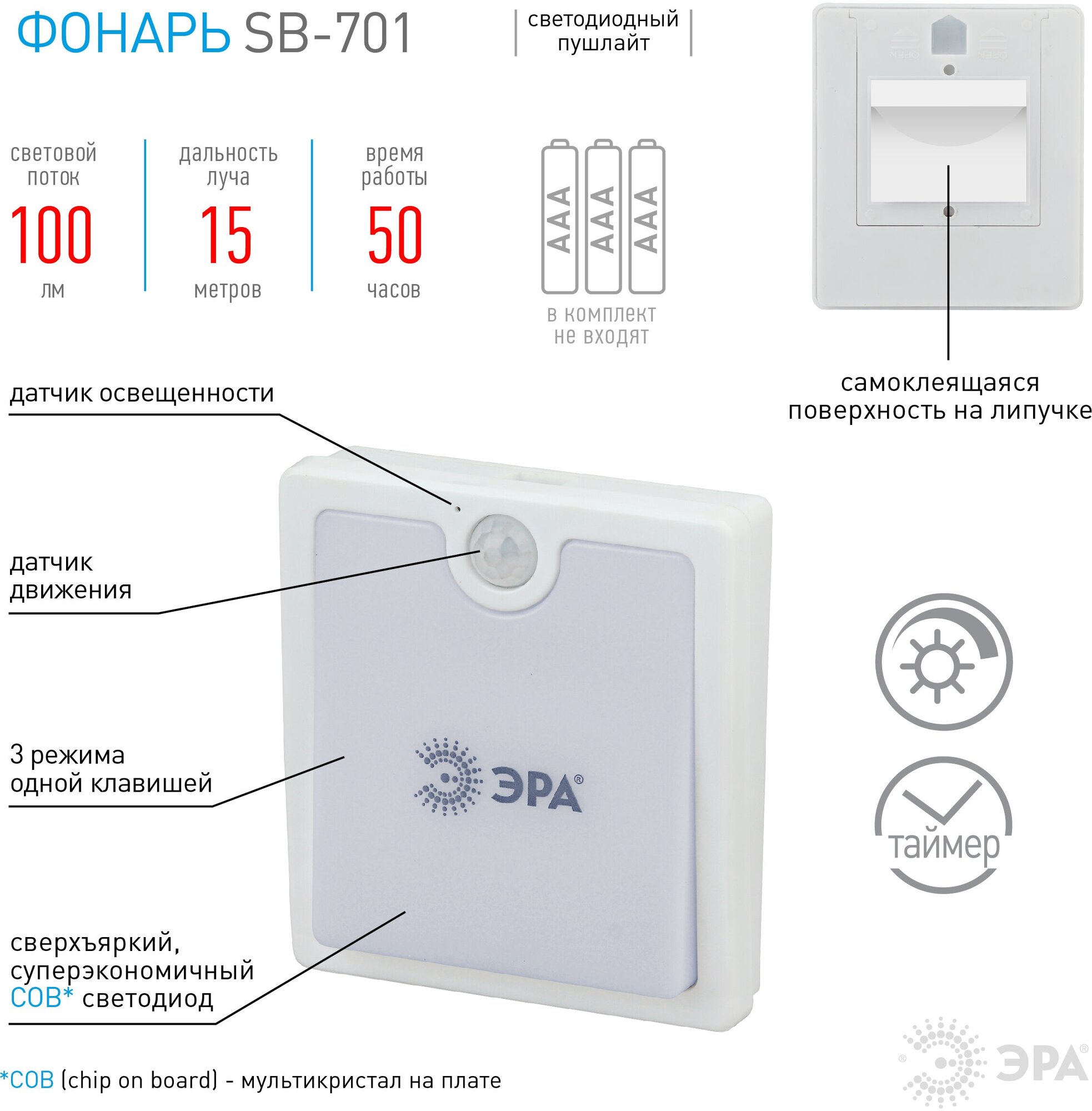 ЭРА Б0033761 Фонарь-подсветка SB-701 пушлайт-датчикдиммер, датчик света, 3хААА не входят .