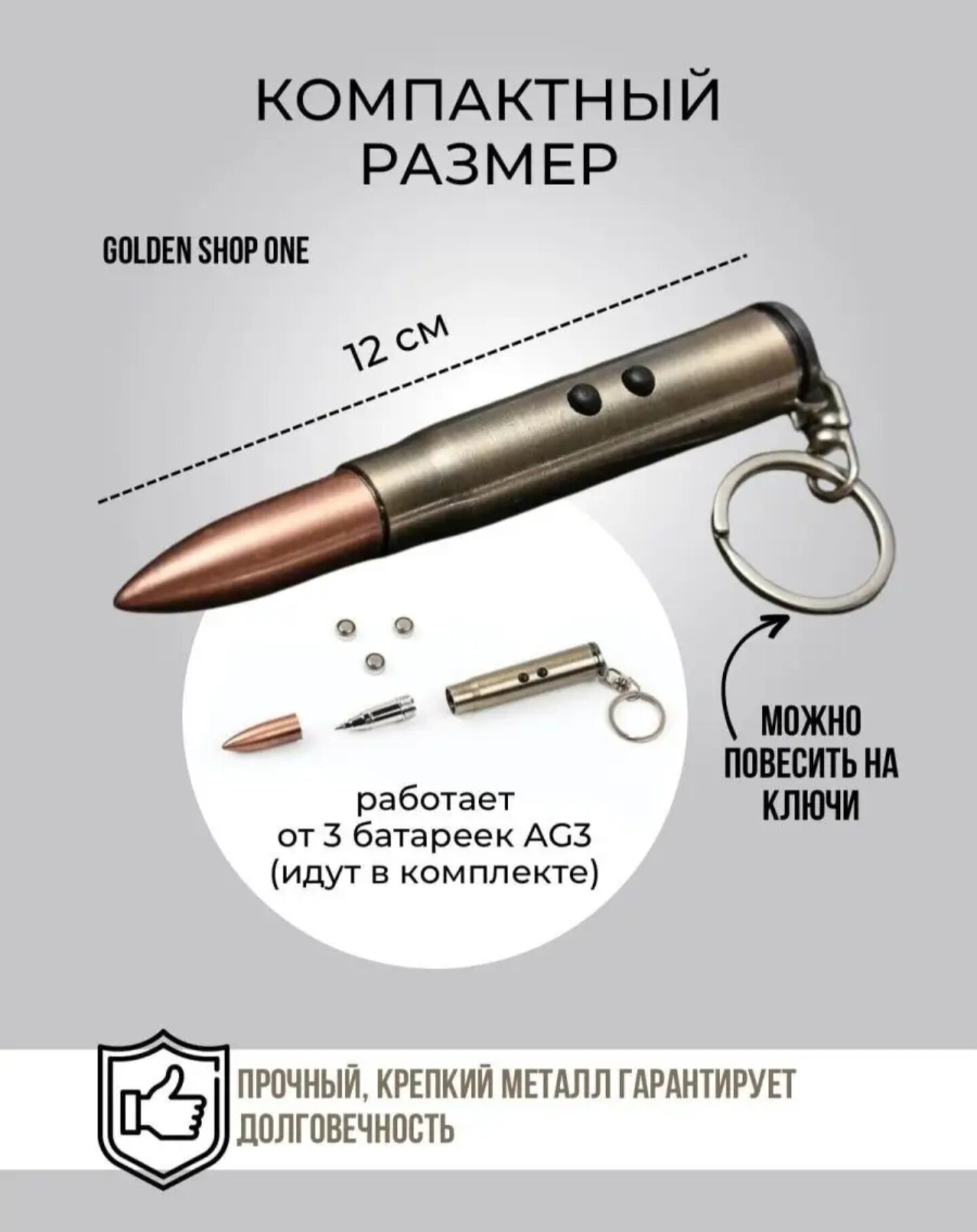 Ниже Вы можете прочитать отзывы на Брелок, фонарик, лазерная указка, ручка в виде "Патрона" 4 в 1, ознакомится с подробными характеристиками, посмотреть интересные обзоры и фотографии на Брелок, фонарик, лазерная указка, ручка в виде "Патрона" 4 в 1.