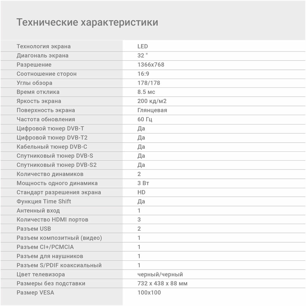 | Отзыв: | Выбирали телевизор в подарок бабушке. Установили на настольную подставку, которая шла в комплекте. Экран 81 см по размеру как раз подошел ей на тумбочку в зал. Акустика мощностью 16 Вт дает громкий звук, что мы и искали. Здорово, что можно использовать телефон в качестве пульта, но этим пользуемся только мы, когда приезжаем к ней в гости. Есть возможность воспроизвести фото и видео с флешки, так что часто привозим фотографии и видеозаписи и смотрим все вместе. |
