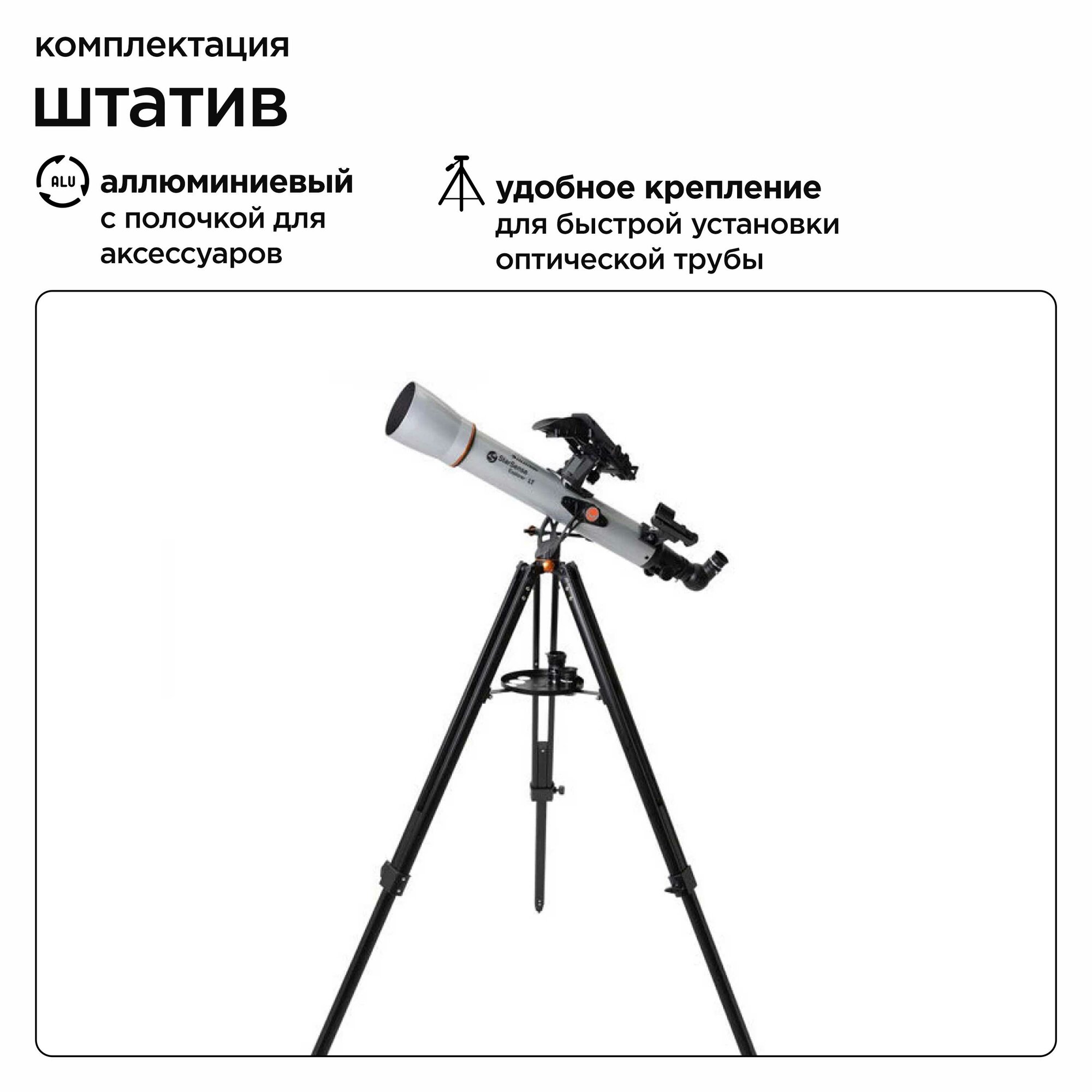 | Комплектация | Оптическая труба телескопа Азимутальная монтировка Алюминиевая тренога Лоток для аксессуаров Окуляры 25 мм и 10 мм Диагональная призма 90° Оптический искатель StarPointer Док-станция для смартфона StarSense Explorer Линза Барлоу 2х Инструкция по эксплуатации |