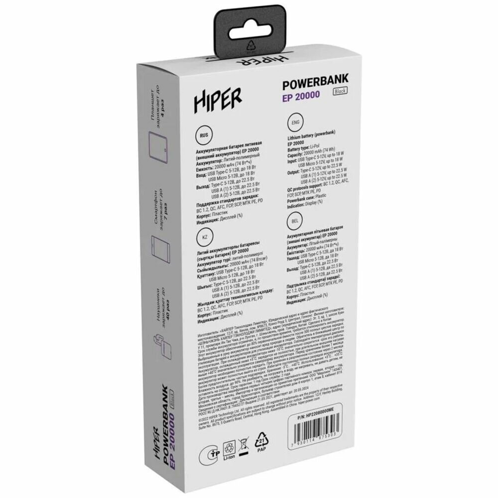 Купить Внешний аккумулятор Hiper EP 20000 20000mAh 3A QC PD черный