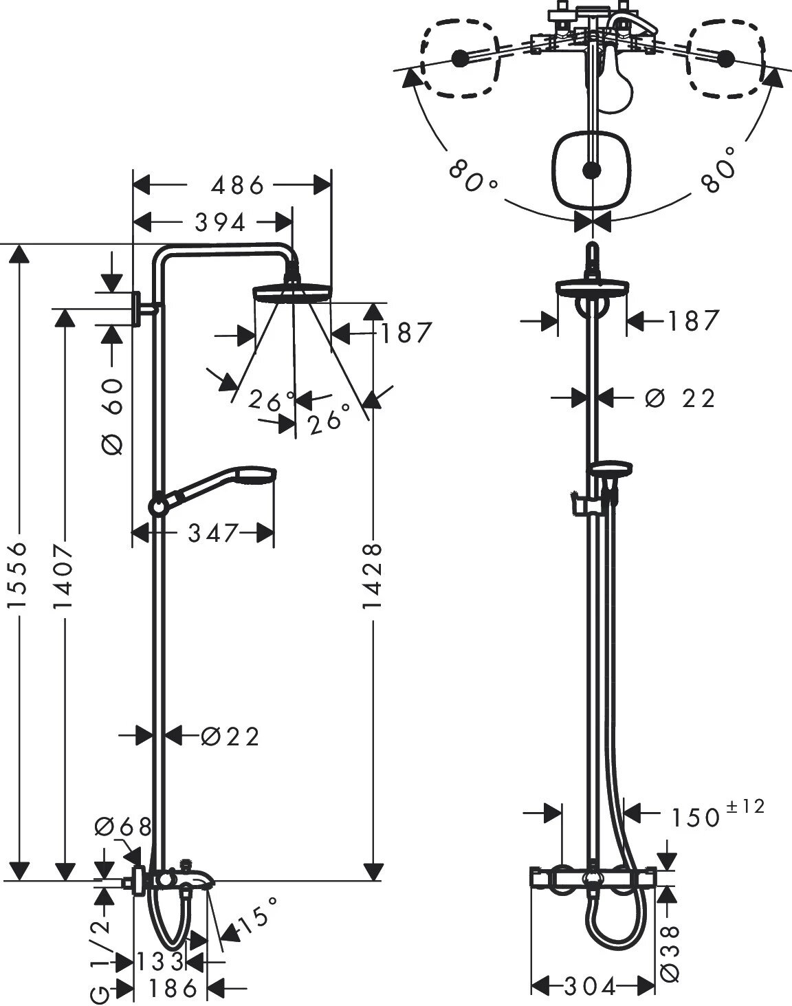 | Дополнительная информация | покрытие белый/хром; высота стойки для душа: 1556 мм; диаметр душевой лейки: 110 мм; длина верхнего душа: 180 мм; ширина верхнего душа: 180 мм |