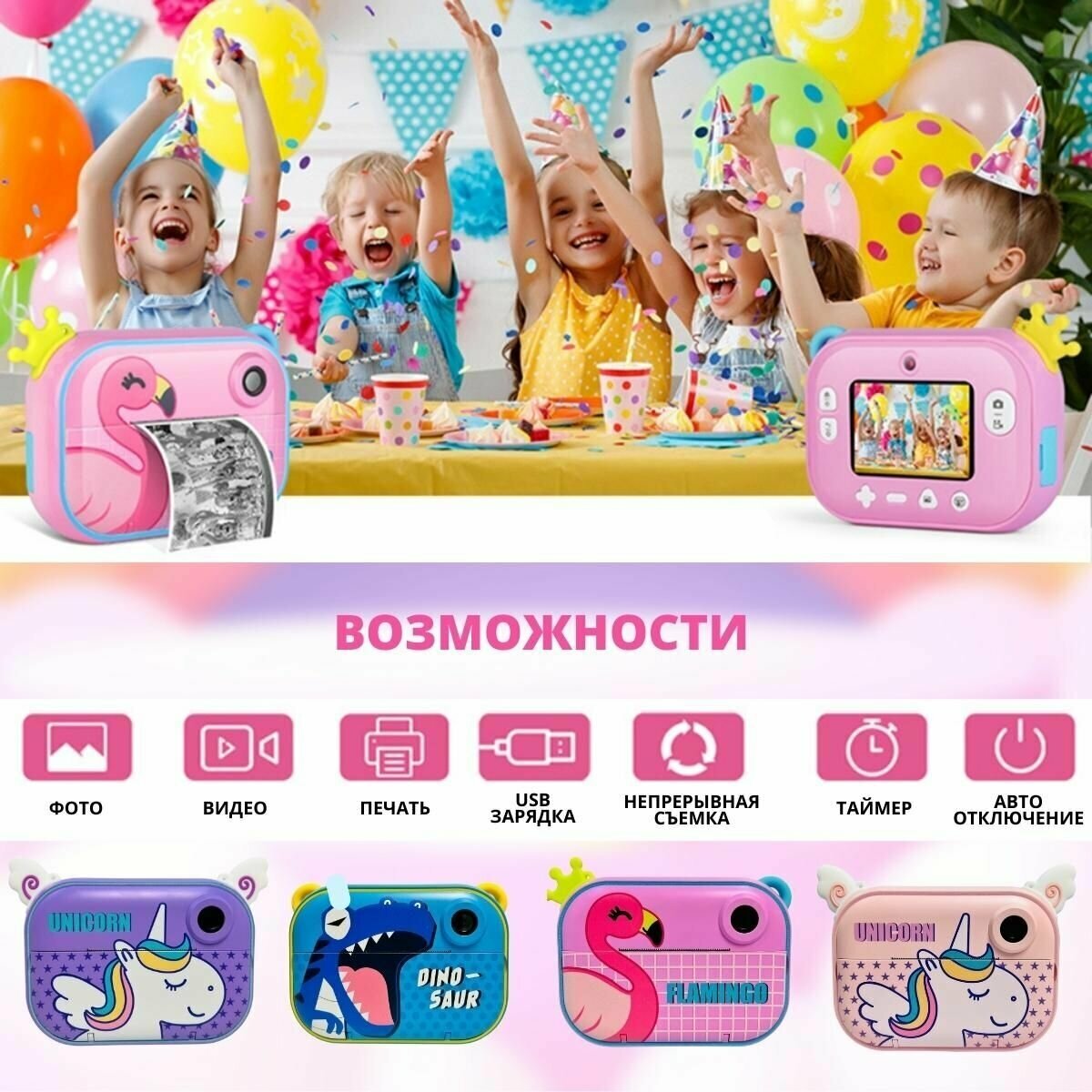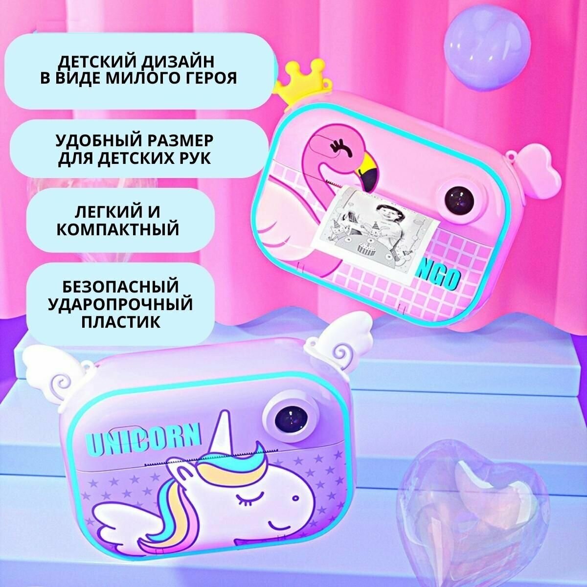 Детский цифровой фотоаппарат/видеокамера с wifi, принтер моментальной печати на термобумаге, microSD/Розовый Единорог