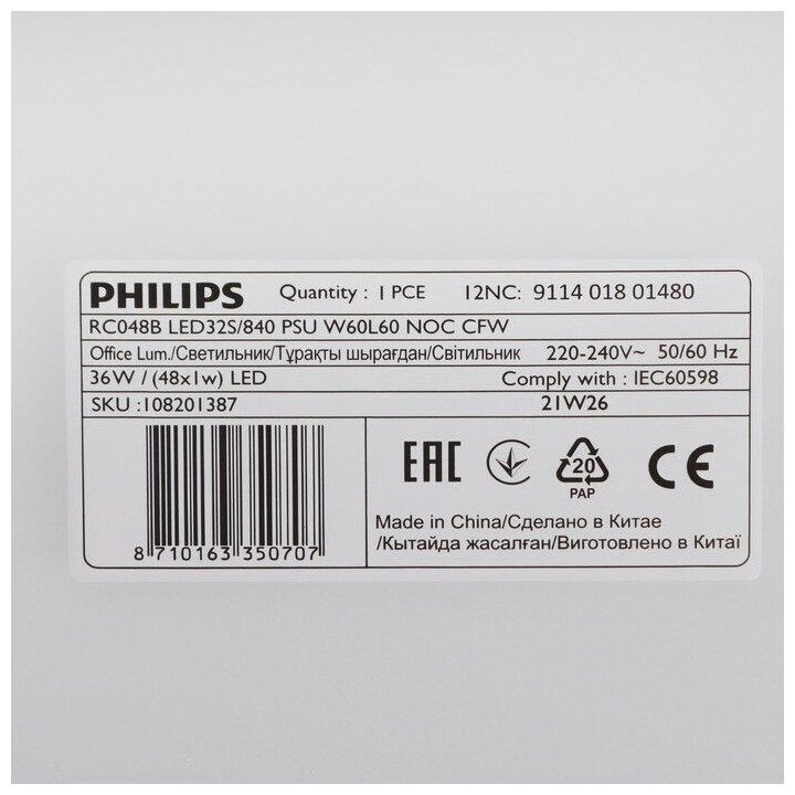 Светильник PHILIPS PANEL RC048B 34mm 36Вт LED32S/840 3200lm 911401801480