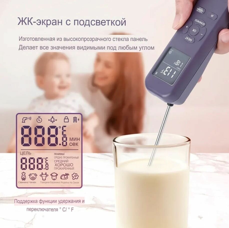 Кулинарный термометр электронный со щупом из нержавеющей стали, термометр для еды, мяса, вина, провод 1 метр / таймер кухонный