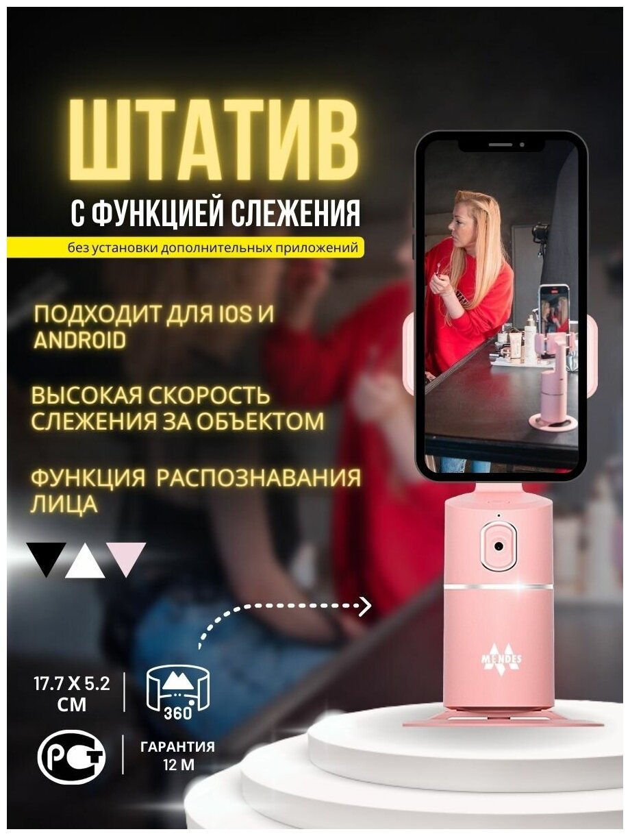 Купить Штатив для телефона / Mendes / Умный штатив монопод для телефона с датчиком движения, 360 / 8 часов без прерывной работы /USB TYPE-C, Цвет Розовый