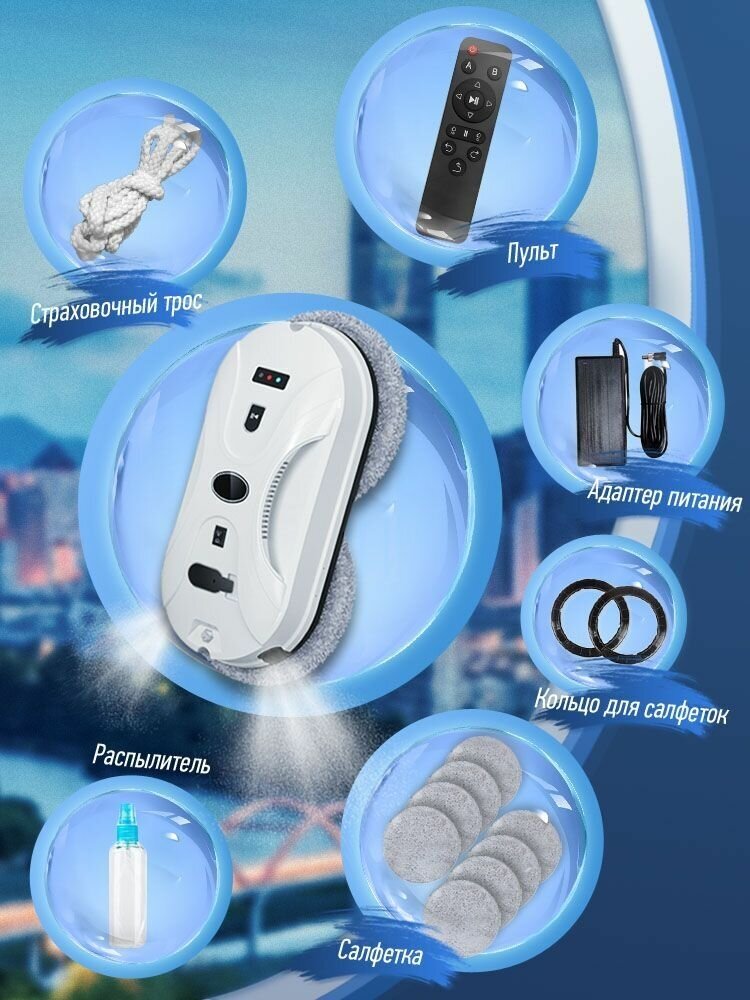 | Дополнительная информация | Робот стеклоочиститель с функцией двойного распыления, пульт дистанционного управления 2.4 Гц, флакон для заправки робота водой, инструкция на русском языке, кольцо для салфеток 4 шт, салфетки из микрофибры 10 шт |