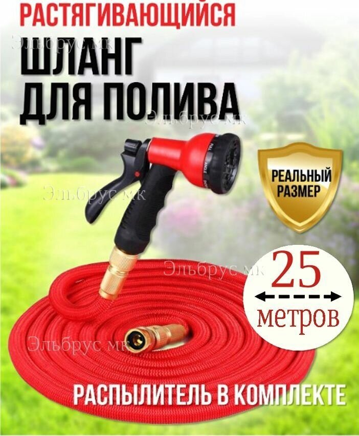 Шланг садовый растягивающийся 25 метров для полива с распылителем с быстросъемом/ 25 метров красный с металлическим соединением, быстросъём