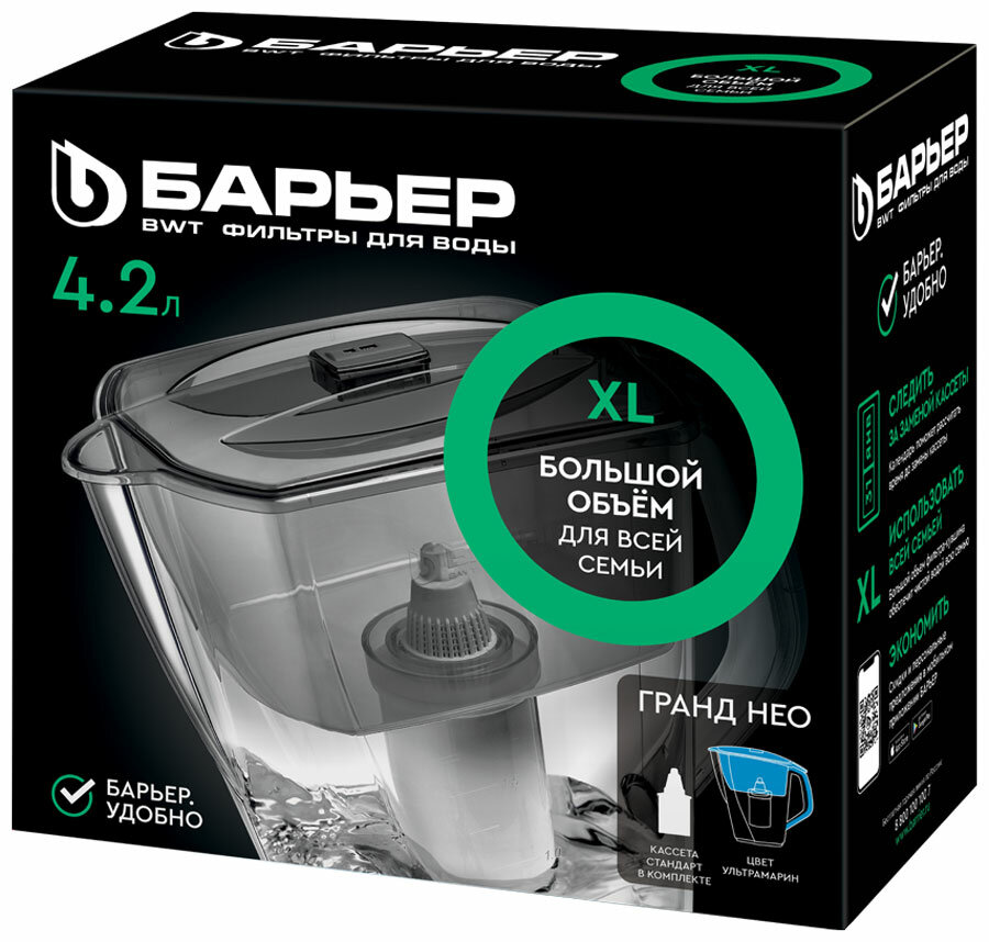 БАРЬЕР Гранд Нео антрацит XL, фильтр-кувшин для очистки воды, 4,2 л, механический индикатор