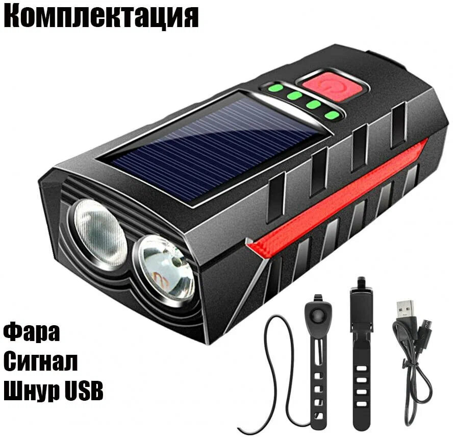 Велосипедный фонарь 400Лм на солнечной батарее и аккумуляторе, передняя фара на велосипед с клаксоном, велофонарь с красным светом интересное:
