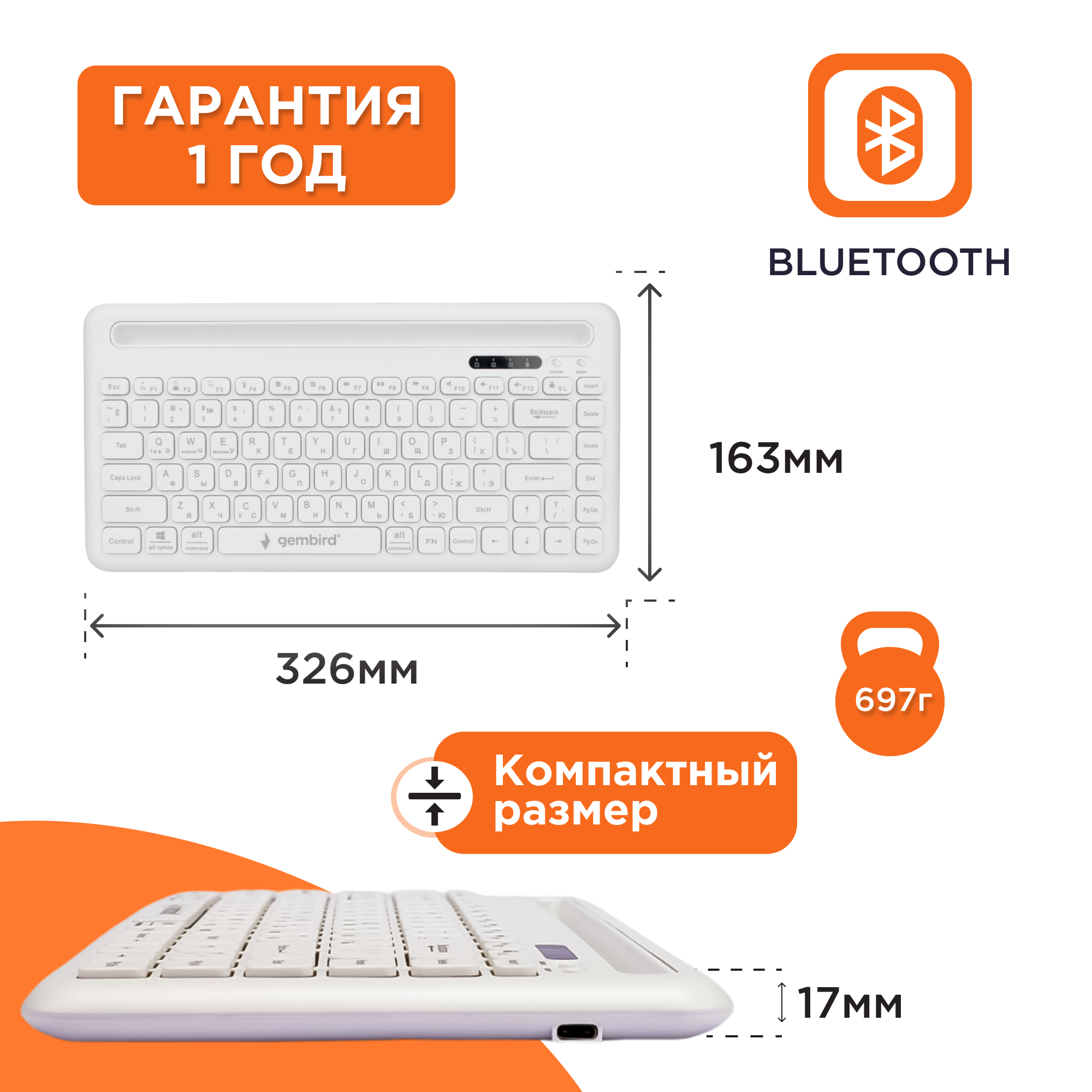 Клавиатура беспроводная, Gembird KBW-8, Bluetooth 5.1, 84 клавиши, подсветка, белая, слот для планшета интересное: