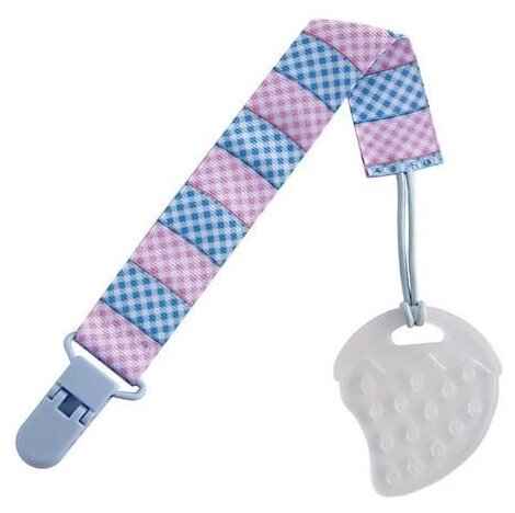 Прорезыватель на держателе ROXY Клубничка. Цвет голубой-розовый (клеточка). Материал держателя -полиэстер, АБС-пластик, Материал прорезывателя -ТЭП